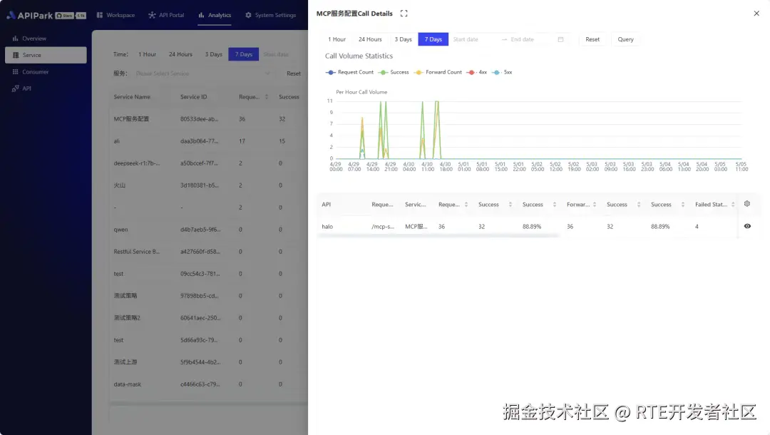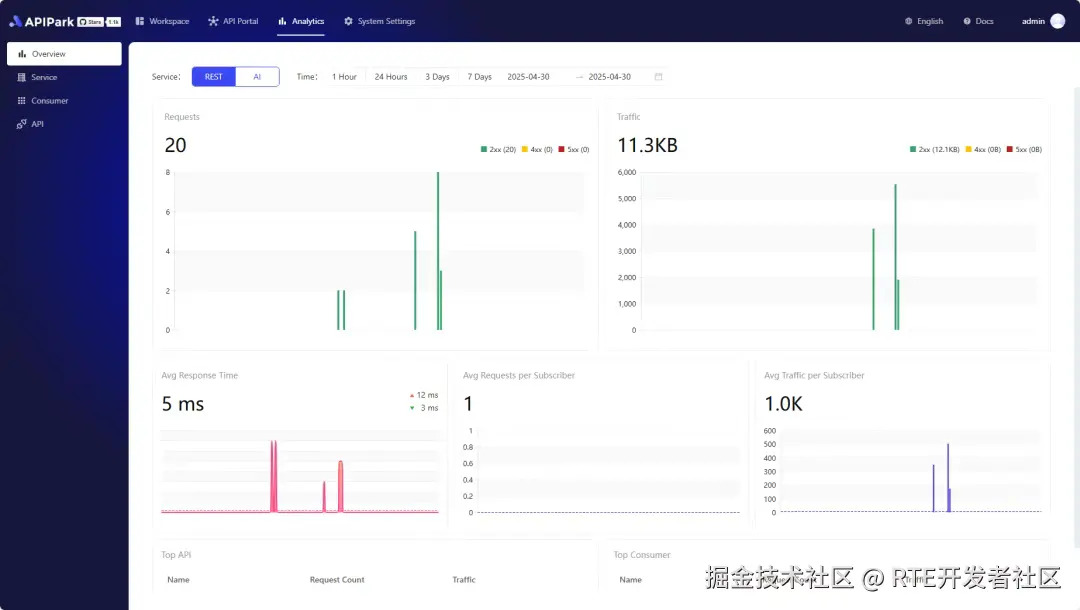 可以通过 APIPark 的统计报表清晰地看到各个服务、API、AI的调用情况,并且提供了详细的请求和返回日志,方便调试。