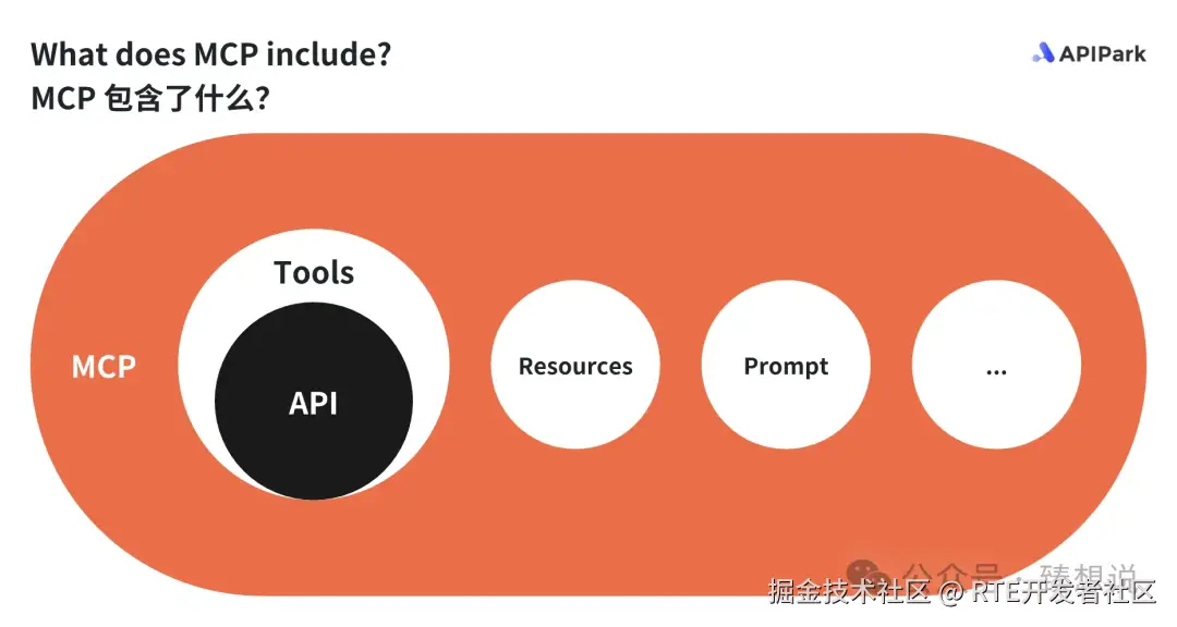 因此可以理解为:MCP是一个包含了多种功能的中间层协议,MCP 里面有一个 Tools 功能专门用来对接第三方API。