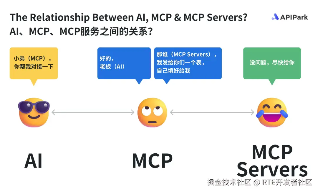 AI 是一个大甲方😎,一大堆小乙方🐶(第三方系统)要和他合作。但是AI是甲方爸爸啊😎,压根懒得挨个和这些小乙方聊,所以找了个小弟🙄(MCP)去干这事。这个小弟给每个小乙方发了个供应商表格,所有乙方都得按这个表格来入库,否则小弟就不理他。