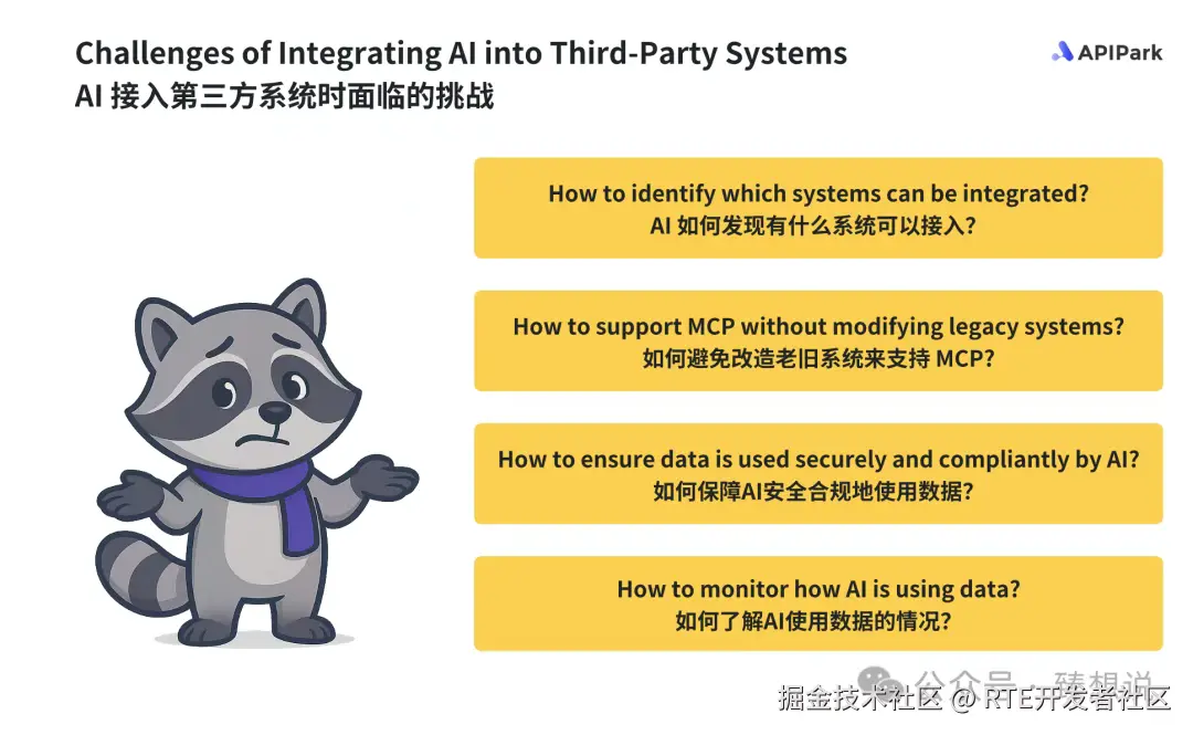 上文也讲到,AI 如果直接接入第三方系统(绝大部分通过API的方式接入),有大量的适配工作,因为 API的多样性导致对接变得复杂, 比如: