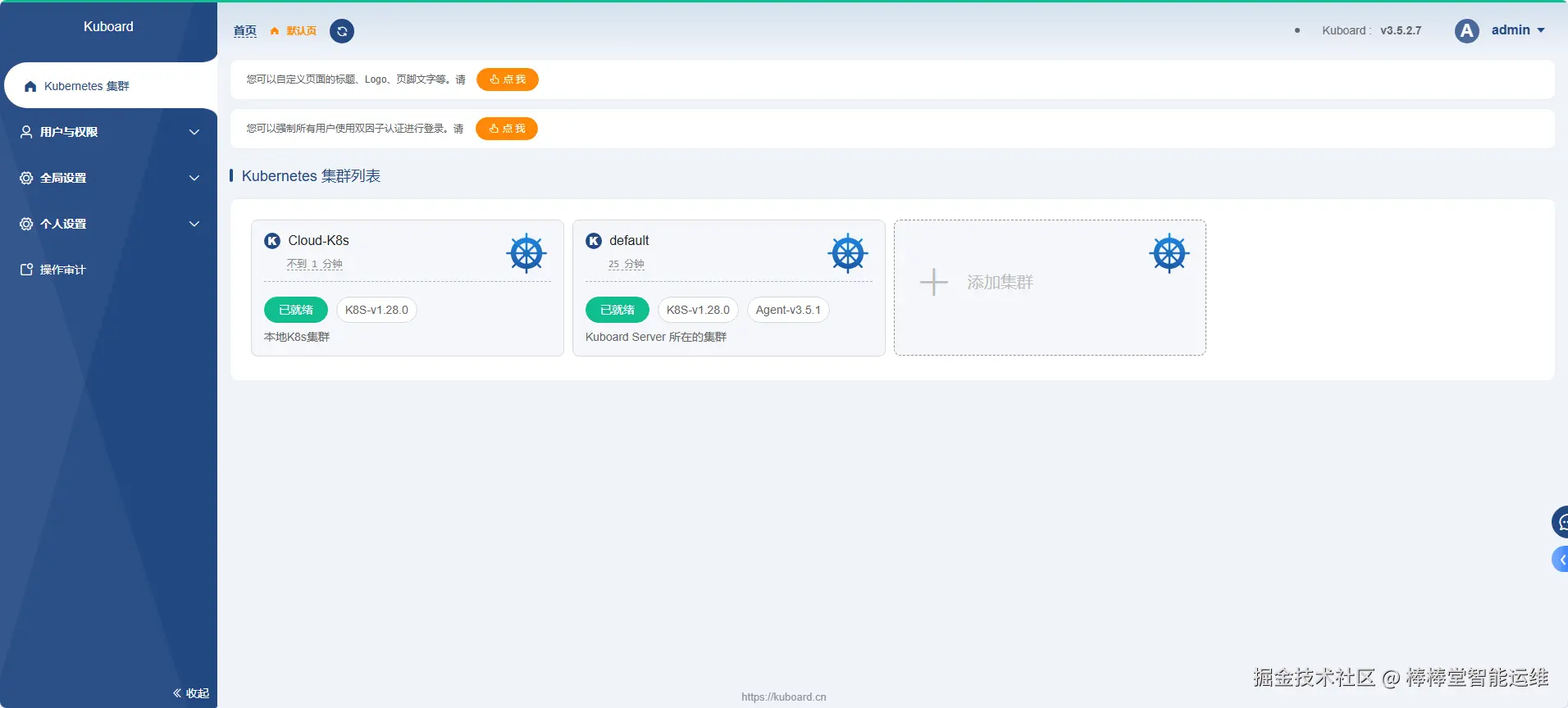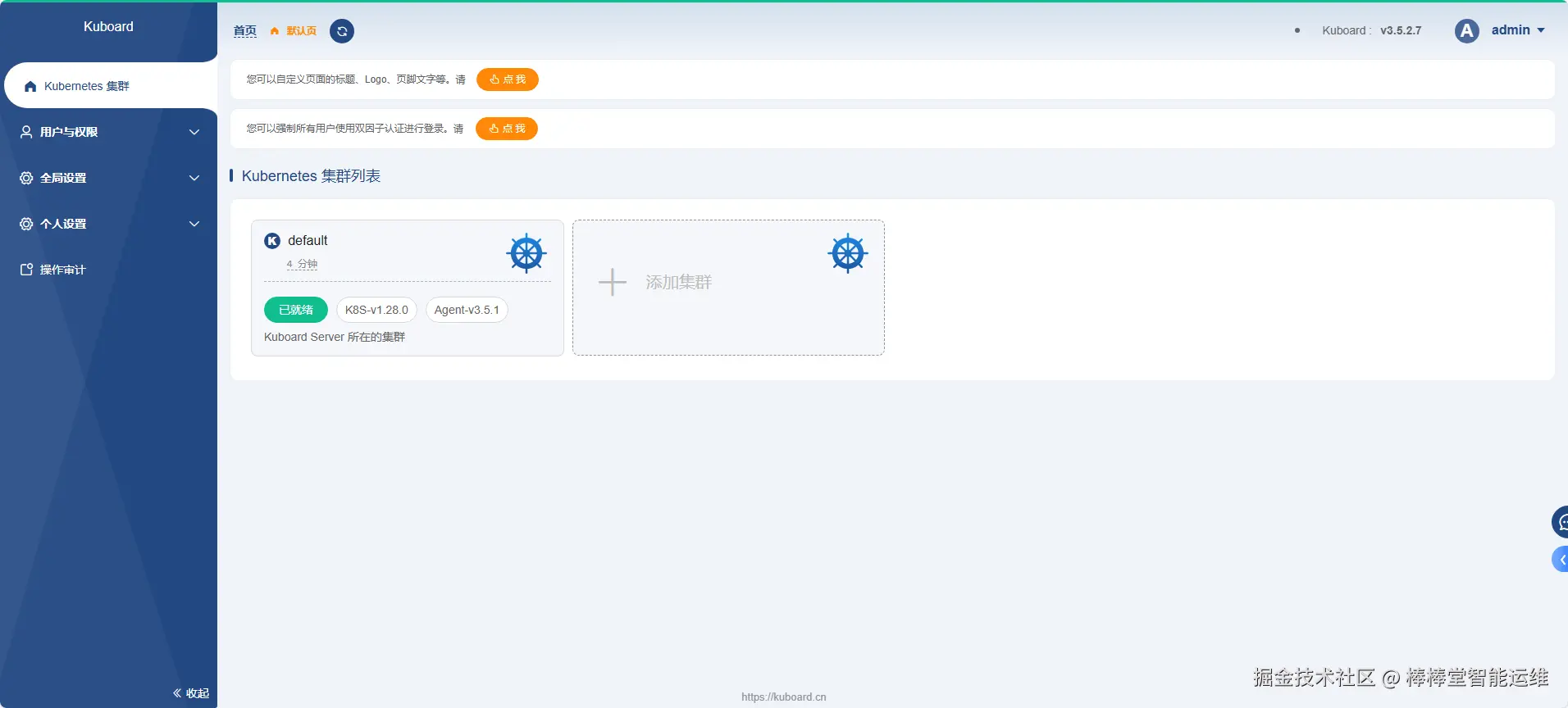 Kuboard部署后的初始用户名:admin,密码:Kuboard123。