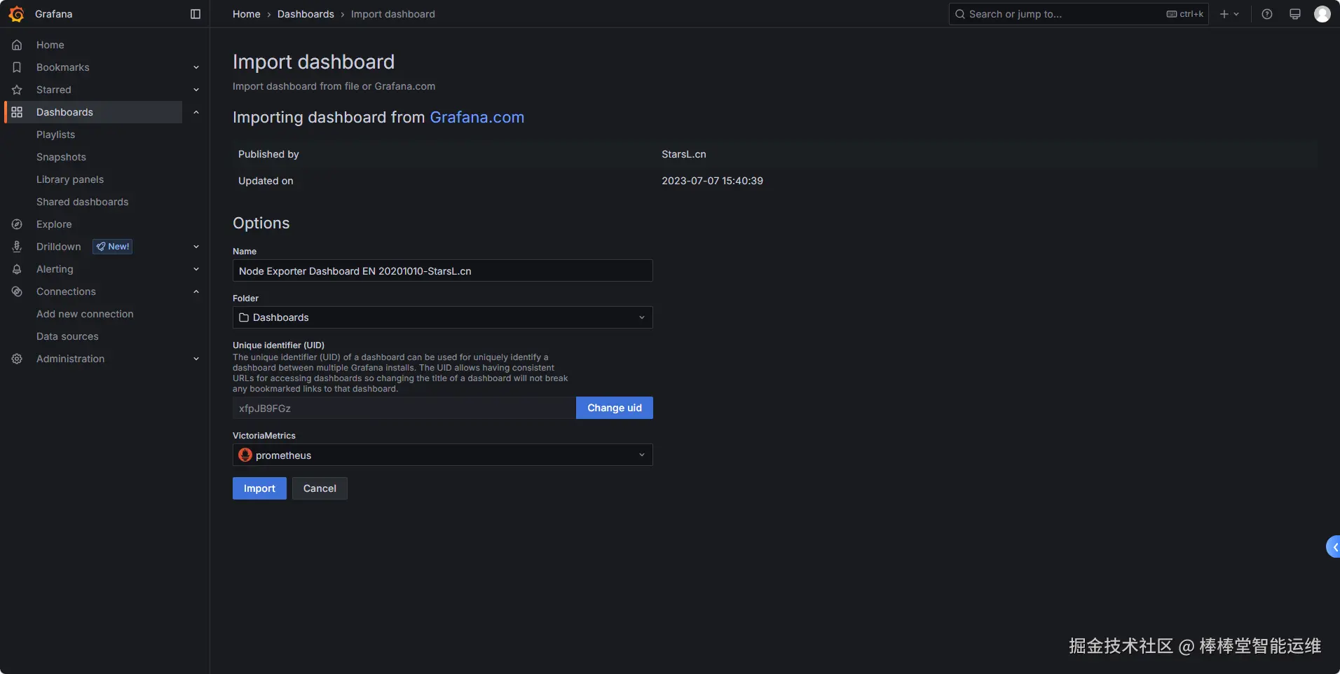 (1)选择左侧菜单“Dashboards”->“New”->“Import”,输入仪表盘ID为11074并载入,如图9-4、图9-5所示。