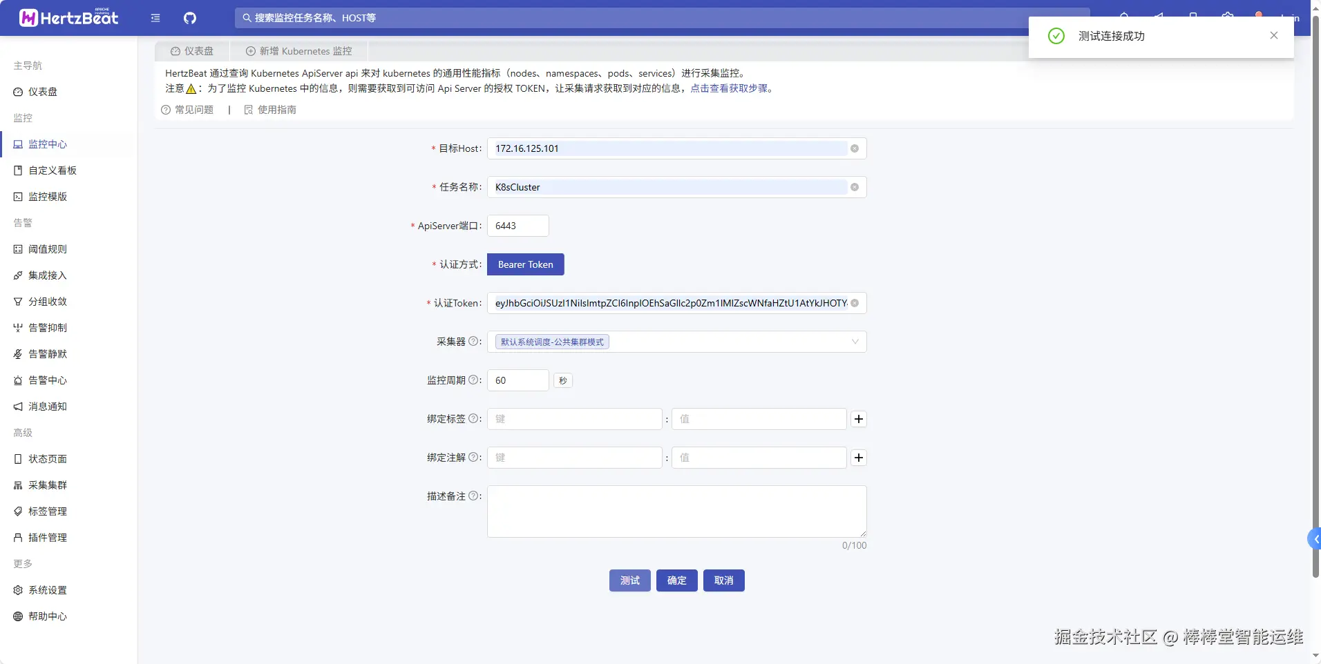在左侧菜单栏选择“监控中心”->“新增监控”->“云原生监控”->“Kubernetes”,配置监控信息测试连接并添加,如图9-10、图9-11所示。