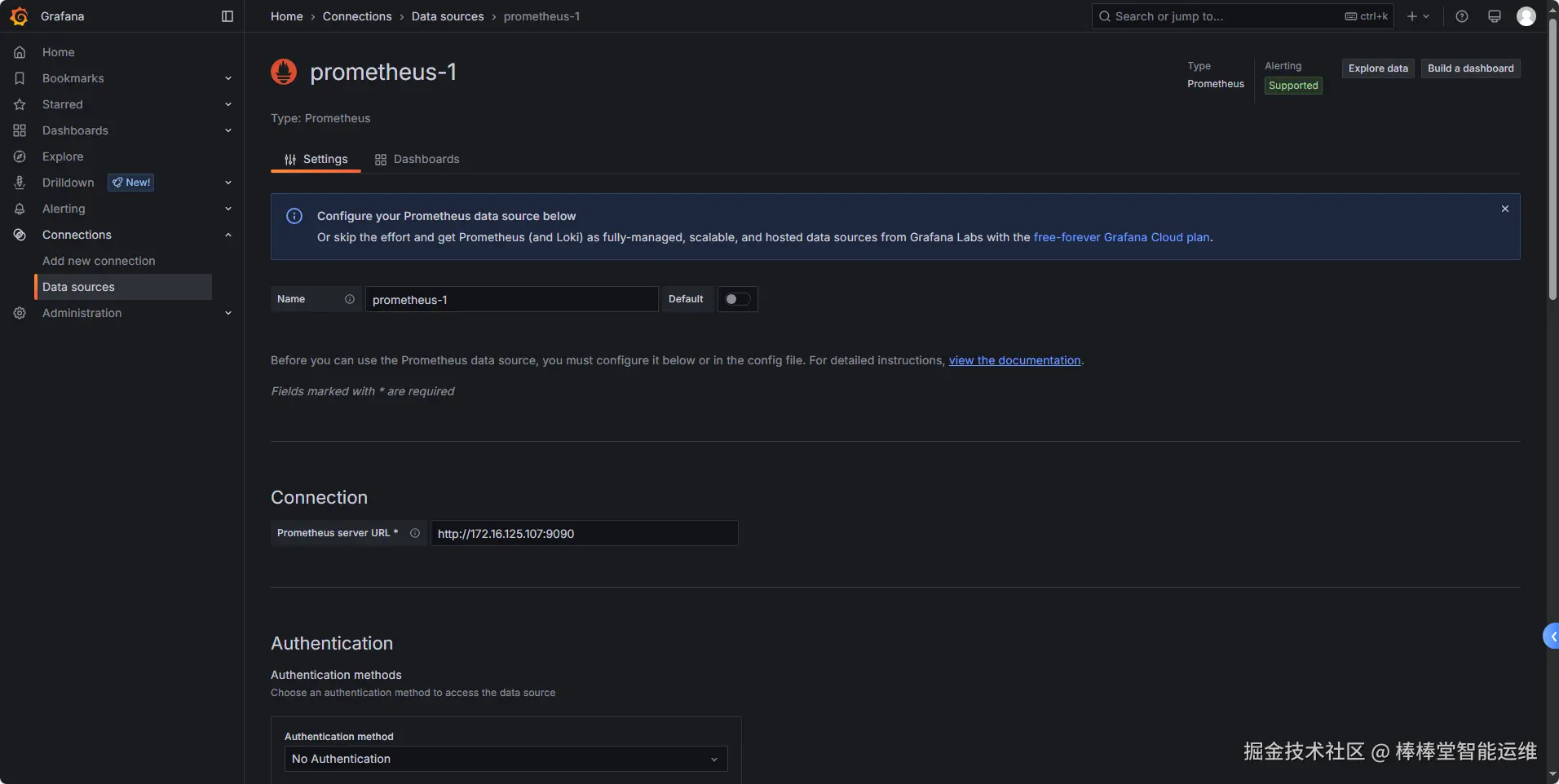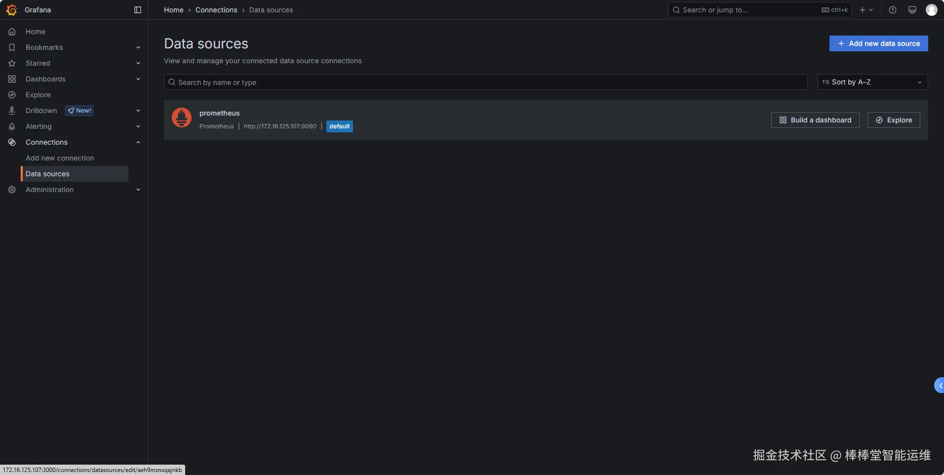 选择左侧菜单“Connections”->“Data sources”,点击右上角【add new data source】按钮,选择prometheus类型的数据源进行配置,在这里配置prometheus服务器的访问路径:http://172.16.125.107:9090,如图9-2所示,其他设置保存默认,最后测试并保存,如图9-3所示。