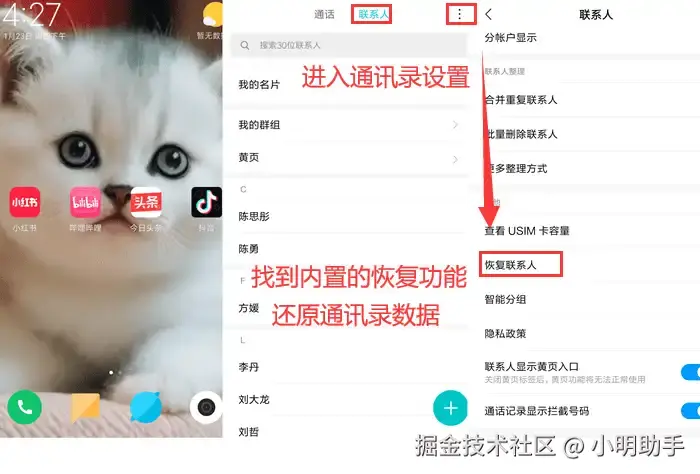 步骤:打开手机通讯录设置,找到【恢复联系人】的类似功能,然后还原近期删除的号码。