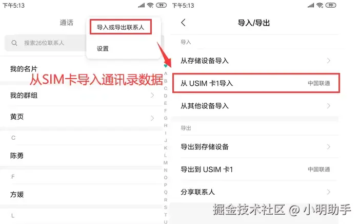 步骤:在联系人界面中,找到并点击【导入或导出联系人】,从SIM卡导入通讯录数据。