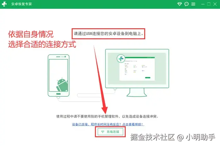 步骤1:软件提供了2种连接方式,要求各不相同。因此,我们需要仔细阅读指引,再按照提示连接手机与电脑。