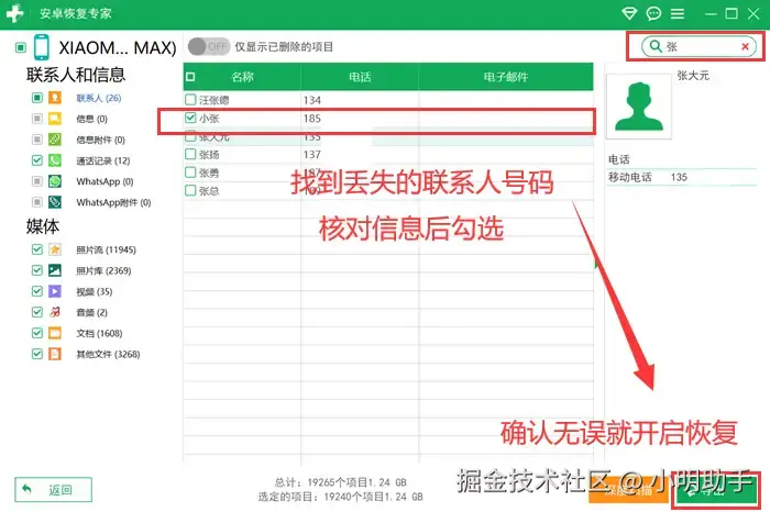 数据 蛙安卓恢复专家能够深入手机内部存储,并清晰地显示多种数据类型,供我们选择。不必担心不会操作,因为全程都有步骤指引,再不济,你也可以按照下面的教程操作哦!