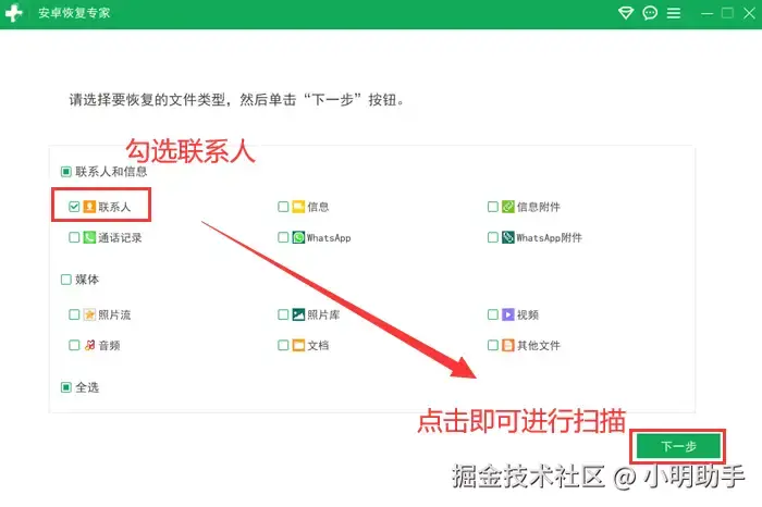 步骤2:在界面中选择【联系人】为对象,点击【下一步】,开始扫描Android手机里的通讯录数据。