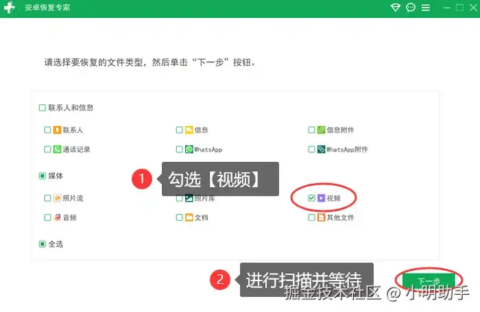 具体步骤2:软件识别到手机后,就会呈现可恢复的文件类型,供我们选择。你勾选【视频】,点击【下一步】,就能进行扫描。