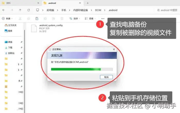 具体步骤:打开电脑上的备份文件夹,找到被删除的视频文件,然后将手机连接到电脑,复制该视频,粘贴到手机存储位置中。