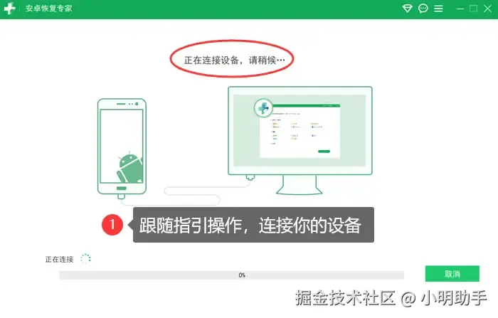 具体步骤1:启动软件后,在手机上打开USB调试模式,然后使用USB数据线将你的Android手机连接到电脑。