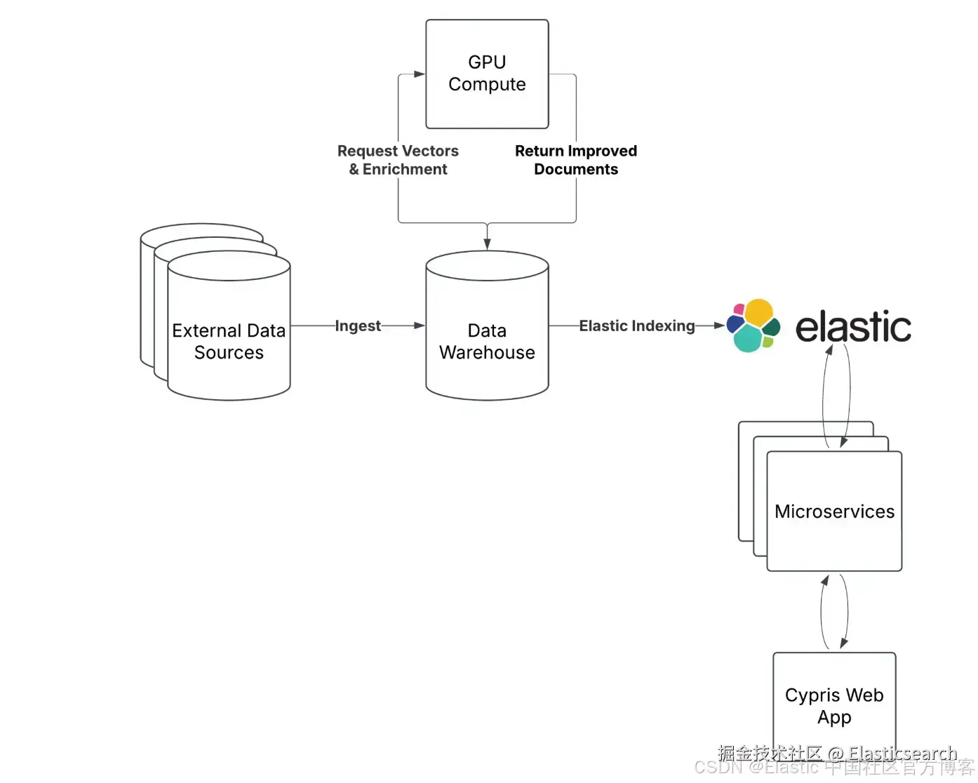 Cypris 的架构包括一个基于 GPU 的外部服务,用于计算向量,然后将这些向量索引到 Elasticsearch 中。