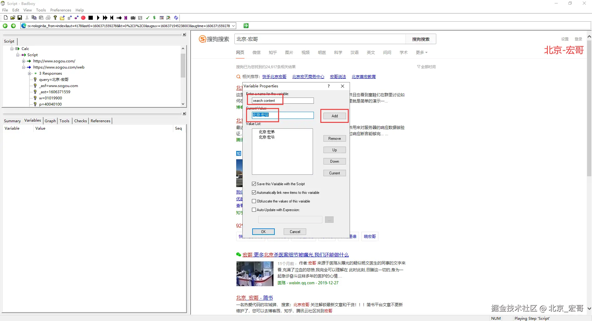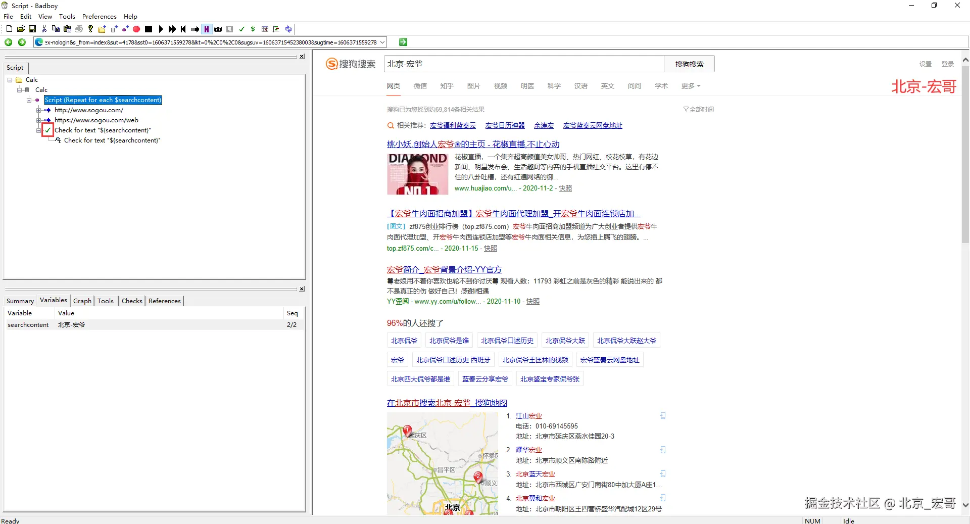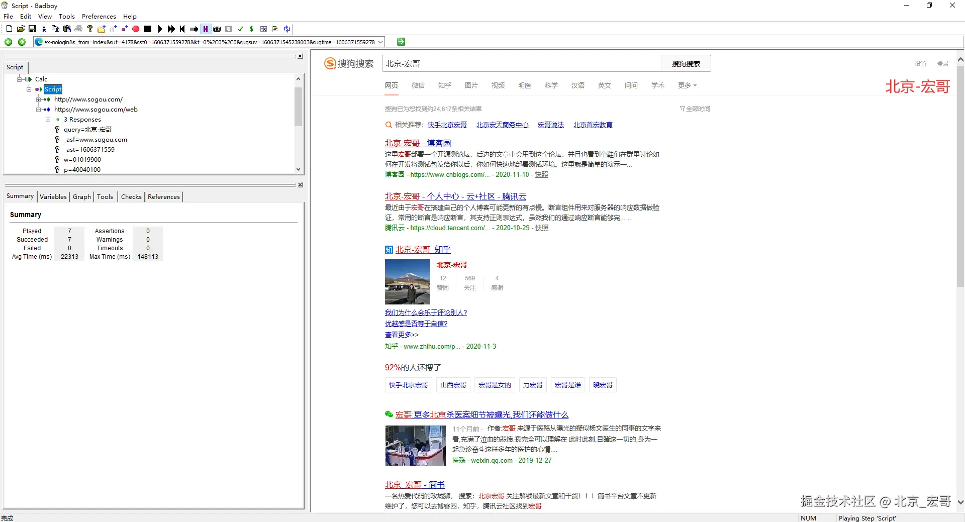 宏哥大致描述一下录制场景:打开浏览器输入搜狗网址,并访问搜狗,在搜索输入框,输入“北京-宏哥”,点击“搜狗搜索”按钮。