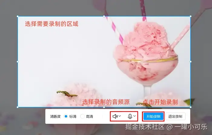 步骤2:进入 “屏幕录制” 这个模式后,就可以在软件中看到录制区域选项和音频源选项了。大家按需调整就好。如果还想调整录制的视频参数,可以点击 “输出设置” 进行调整。全部搞定后,点击 “开始录制” 按钮录制视频。