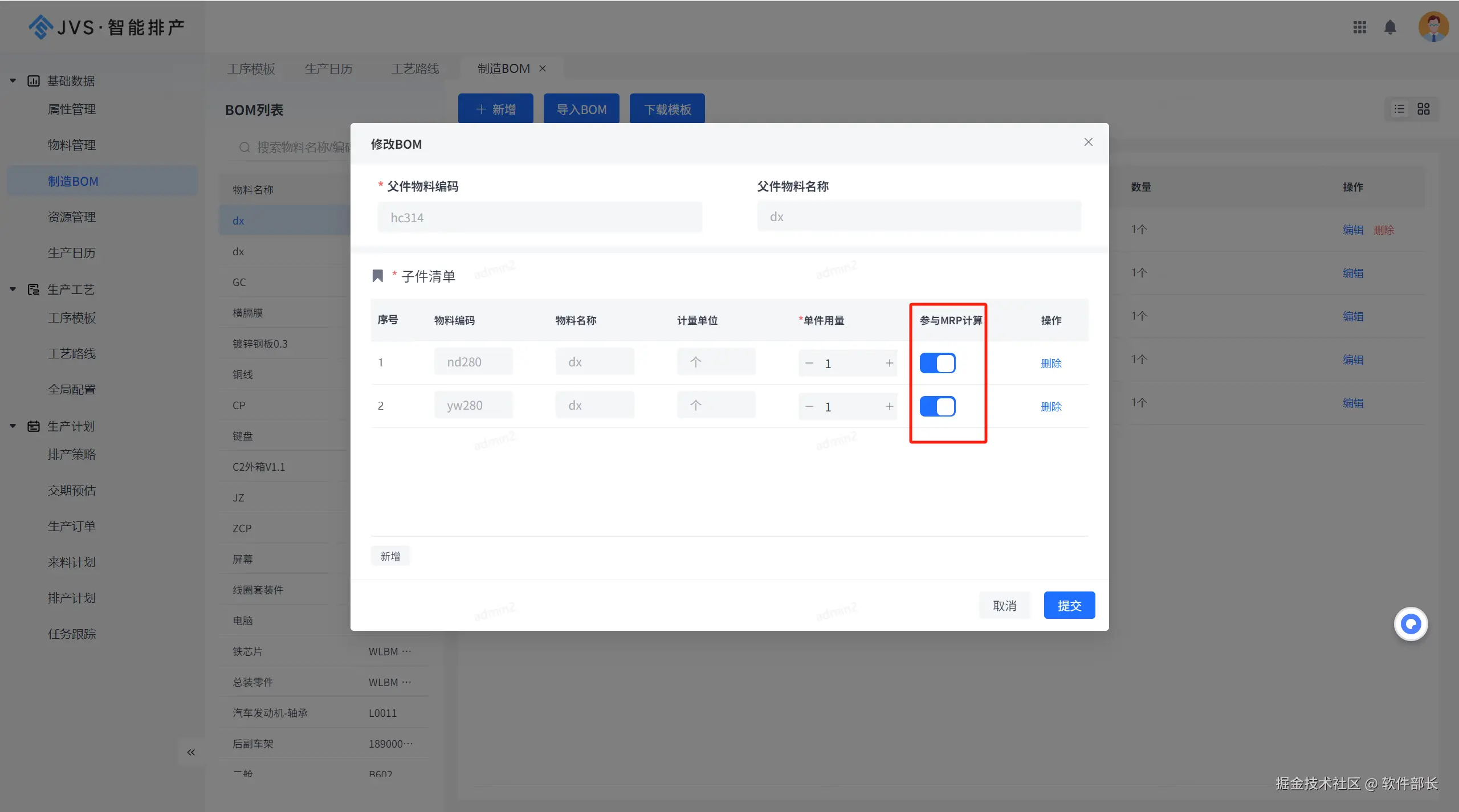 2、BOM新增可设置指定物料是否参与MRP计算选项。