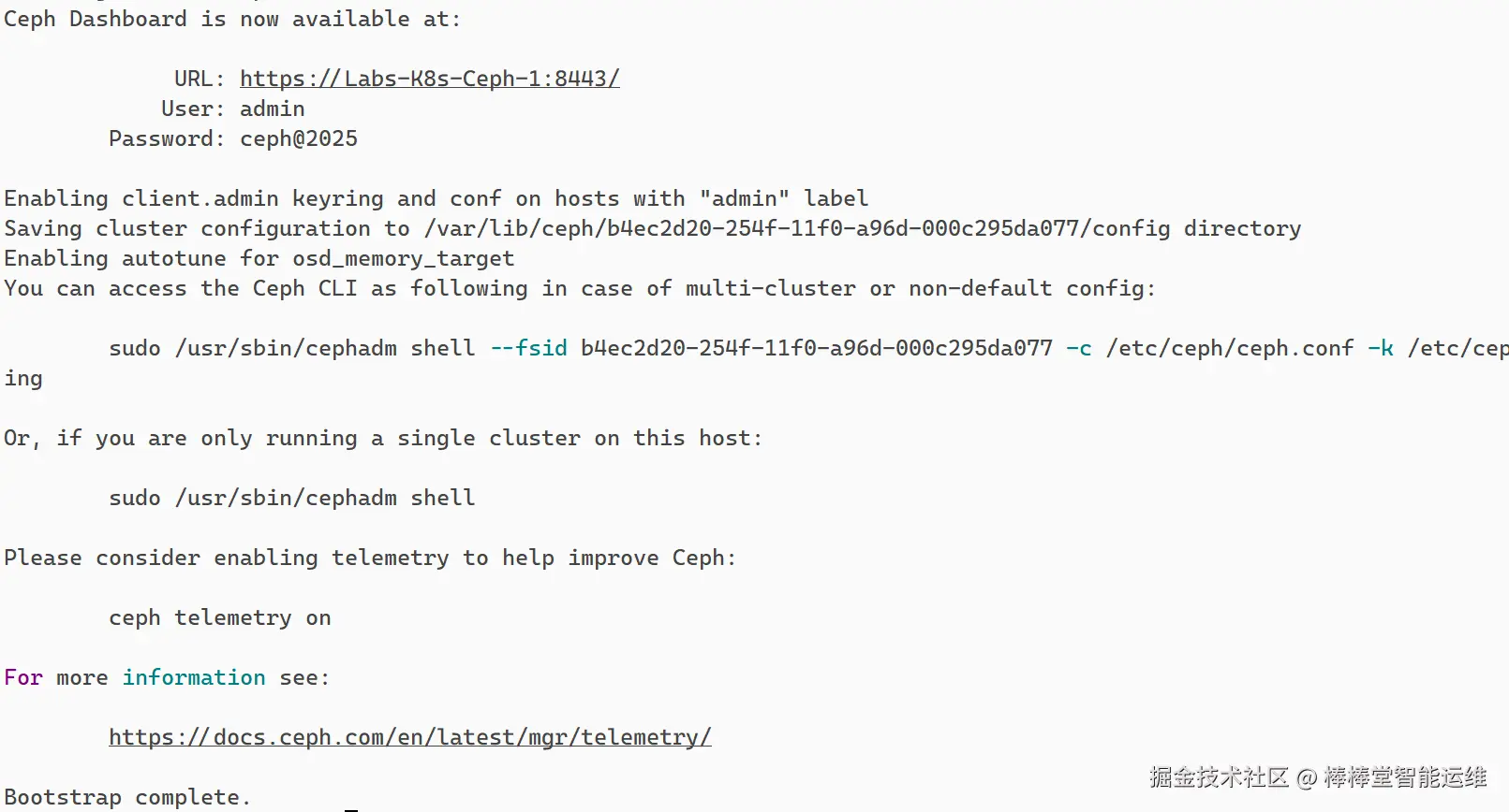 初始化完成提示“Bootstrap complete.”证明Ceph集群初始化完成,如图3所示。