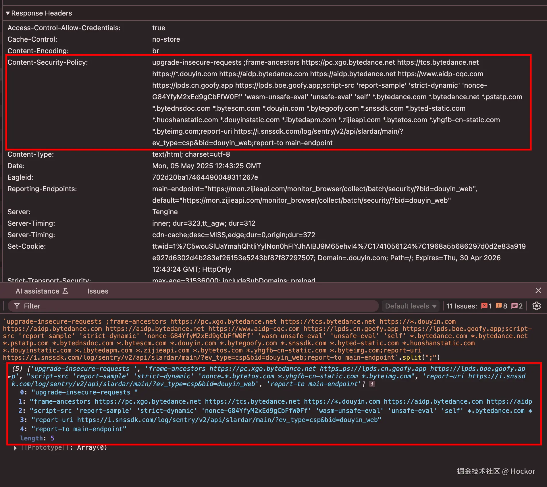 如下图,抖音官网的响应头中关于 CSP 相关的配置