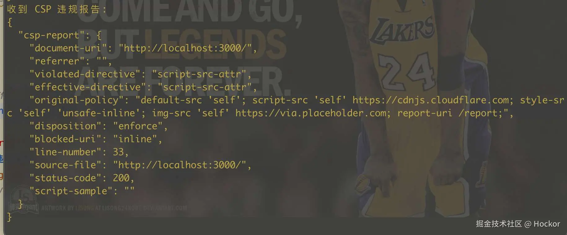 report-uri /report;并且有违规发生,服务器端的控制台会打印出接收到的违规报告的 JSON 数据。