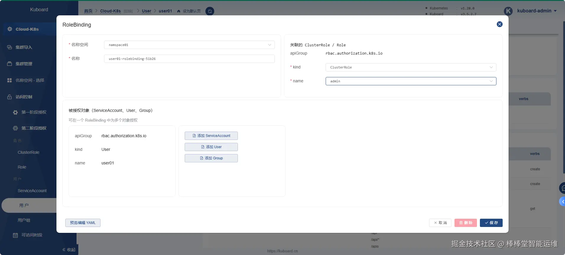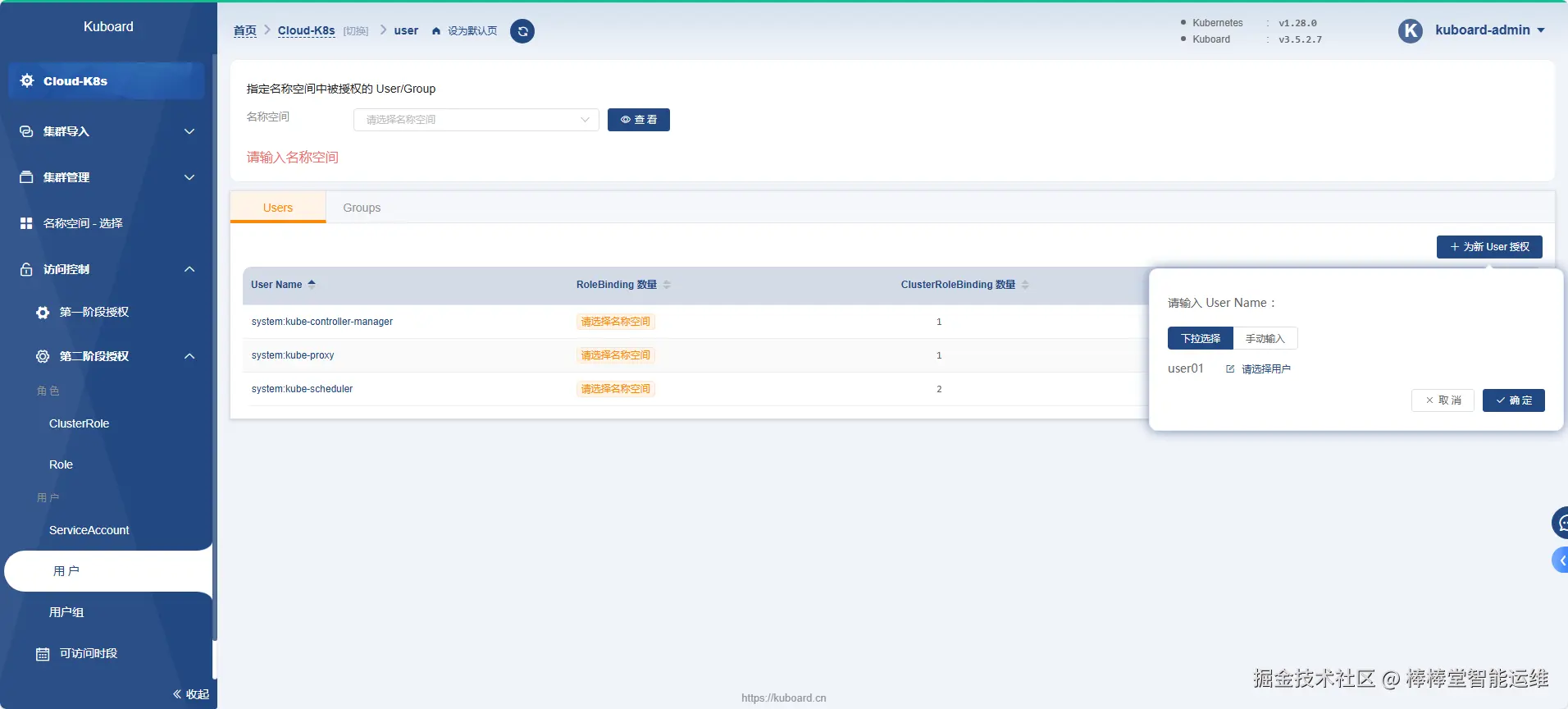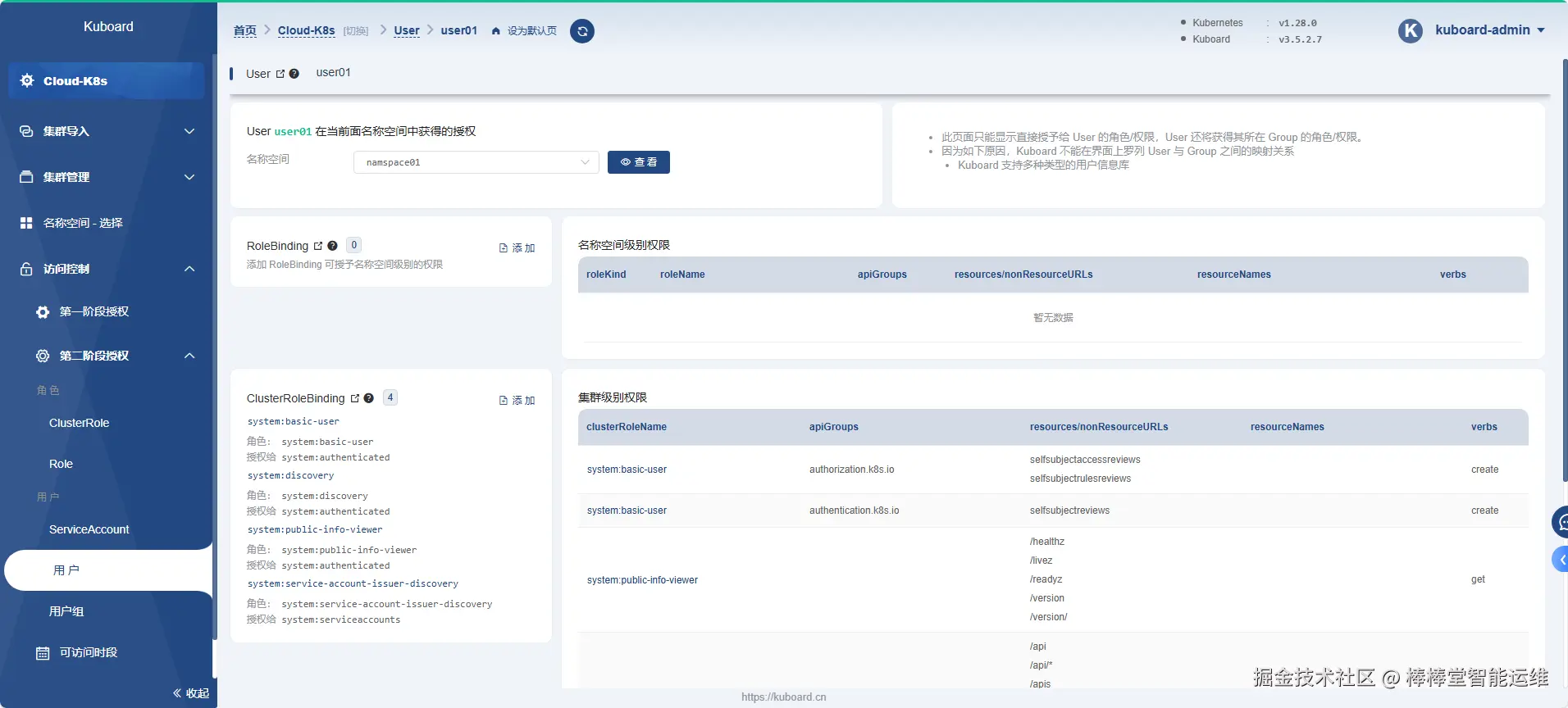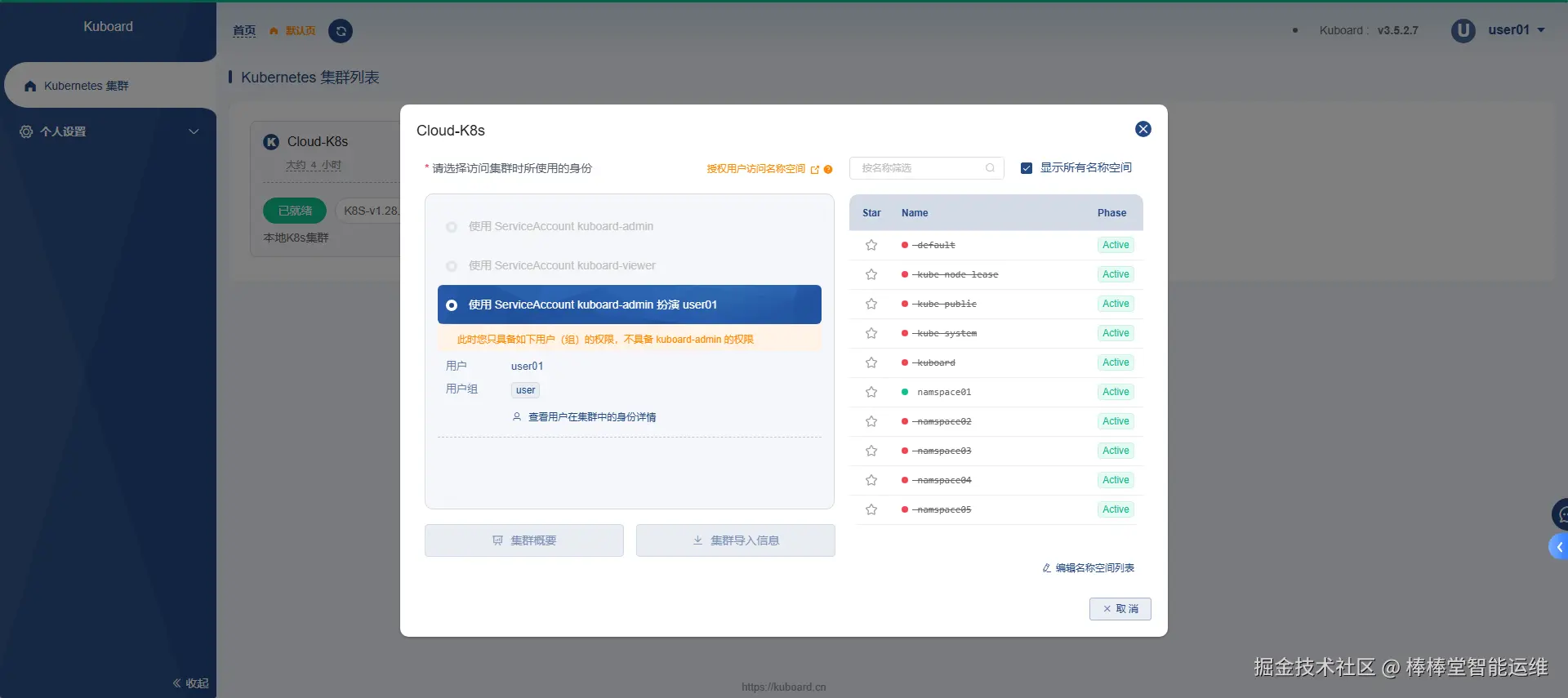 步骤1:用创建的用户user01登录Kuboard,进入命名空间namespace01。
