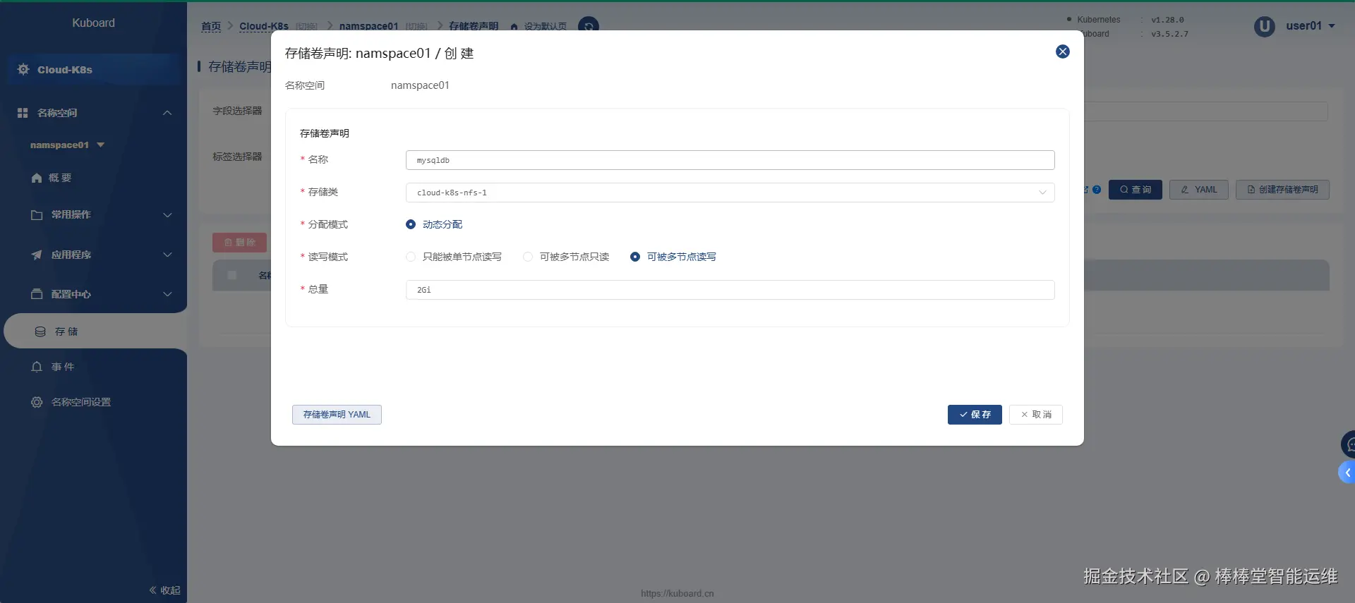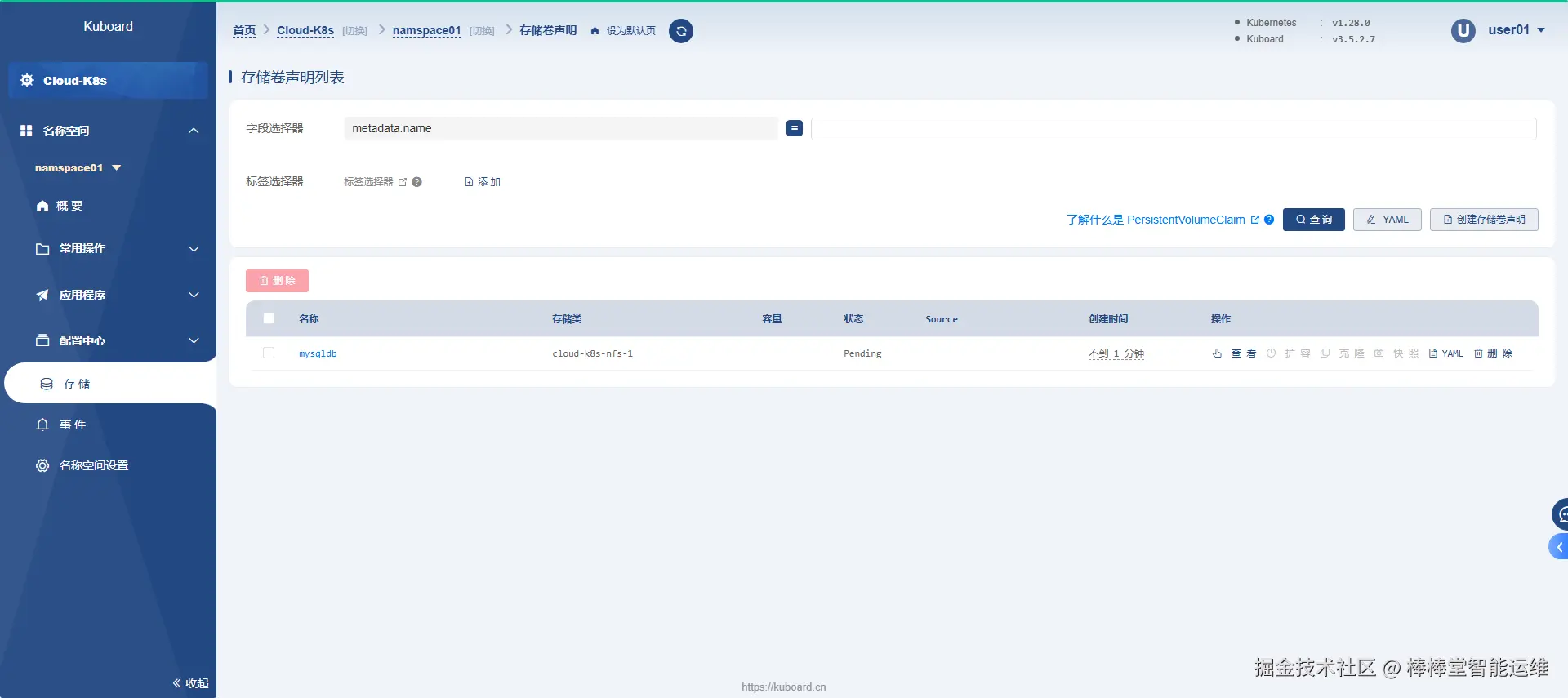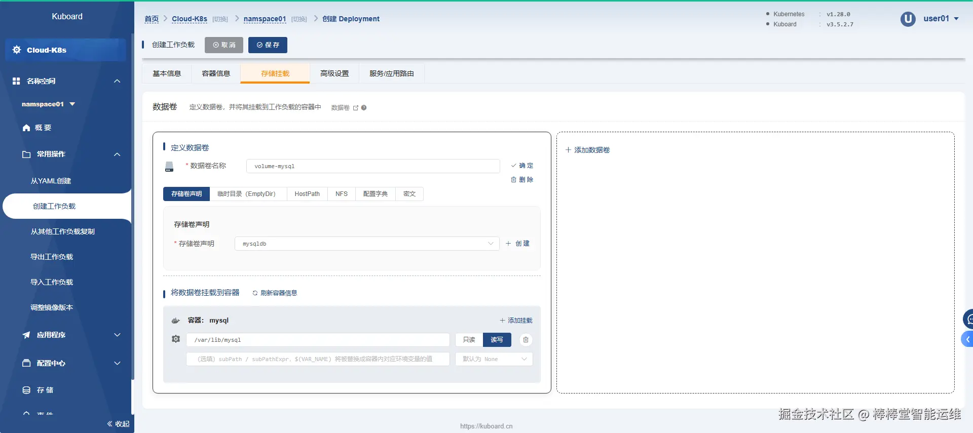 步骤2:创建存储卷声明PVC,用于挂载MySQL的数据目录,点击“存储”->“创建存储卷声明”,配置如图8-16所示,保存并应用,如图8-17所示。