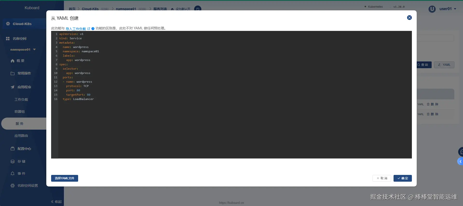 (4)发布wordpress服务。在“服务”页面,点击YAML,通过yaml文件部署服务,如图8-27所示。