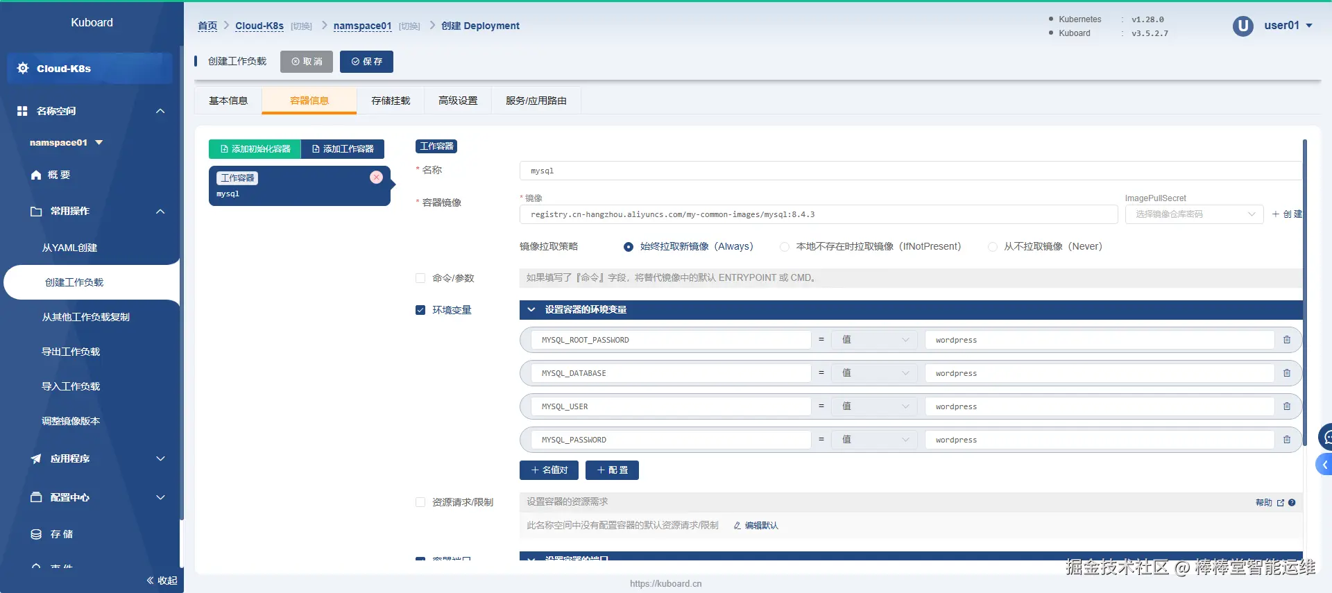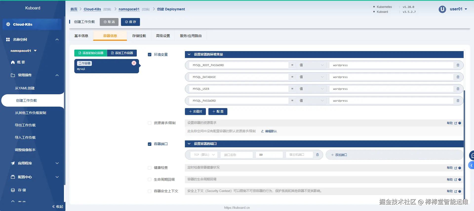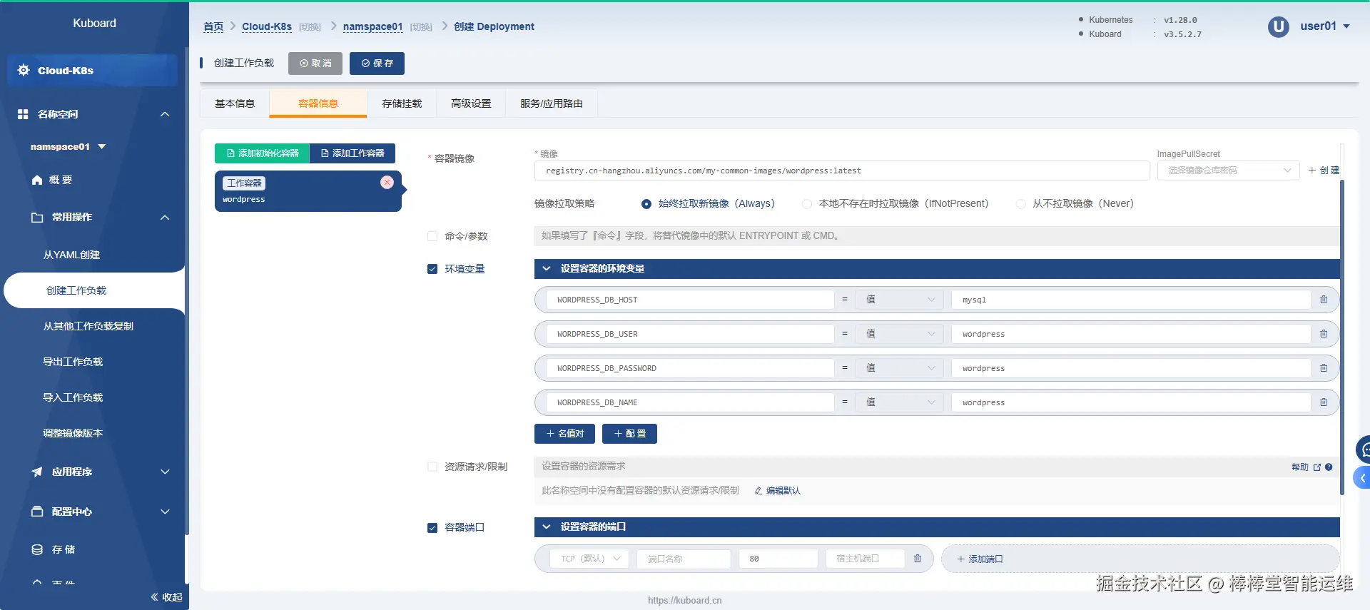 (1)创建wordpress工作负载,配置信息如图8-24所示。