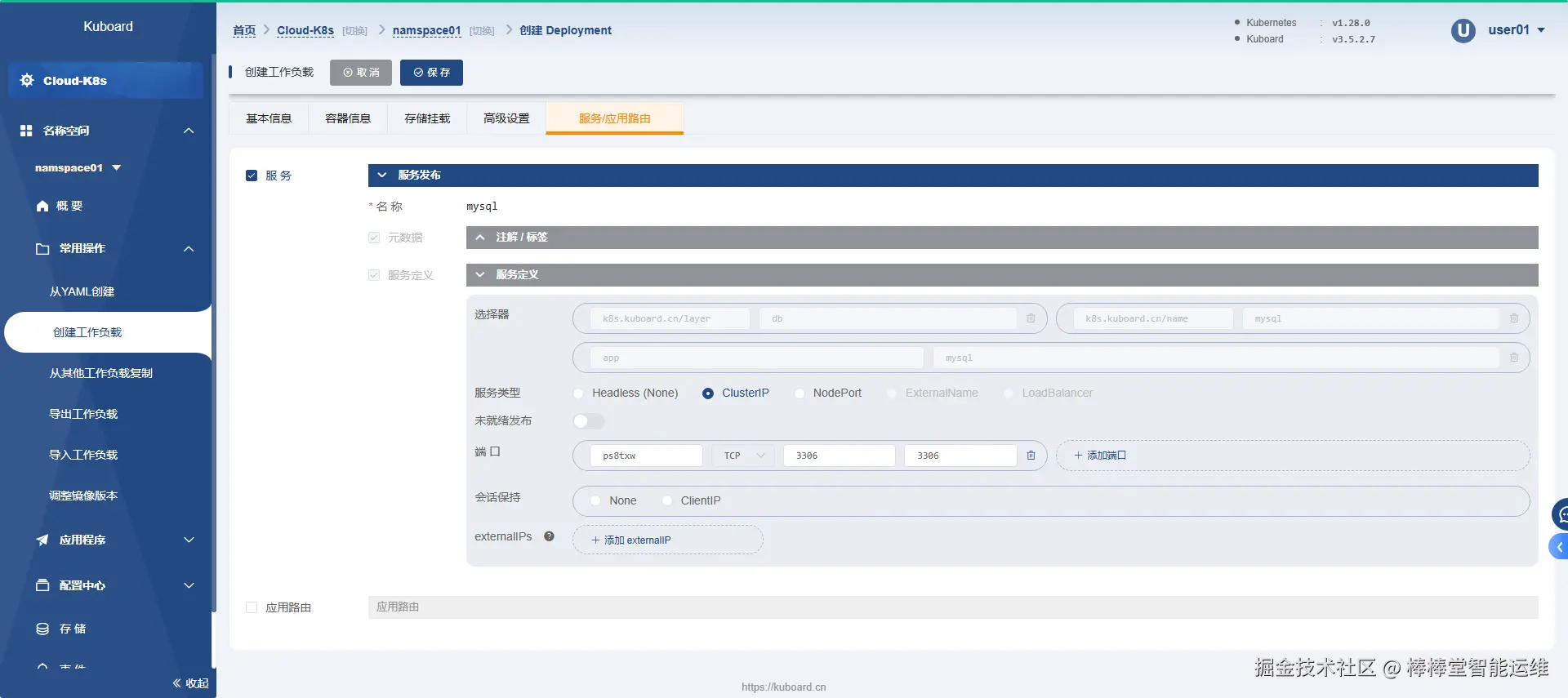 (4)在“服务/用于路由”选项卡中,点击“服务”复选框,展开服务发布,设置服务类型为ClusterIP,设置Port和targetPort的值为3306,配置信息如图8-22所示,点击保存、应用,等待镜像拉取并成功运行,如图8-23所示。