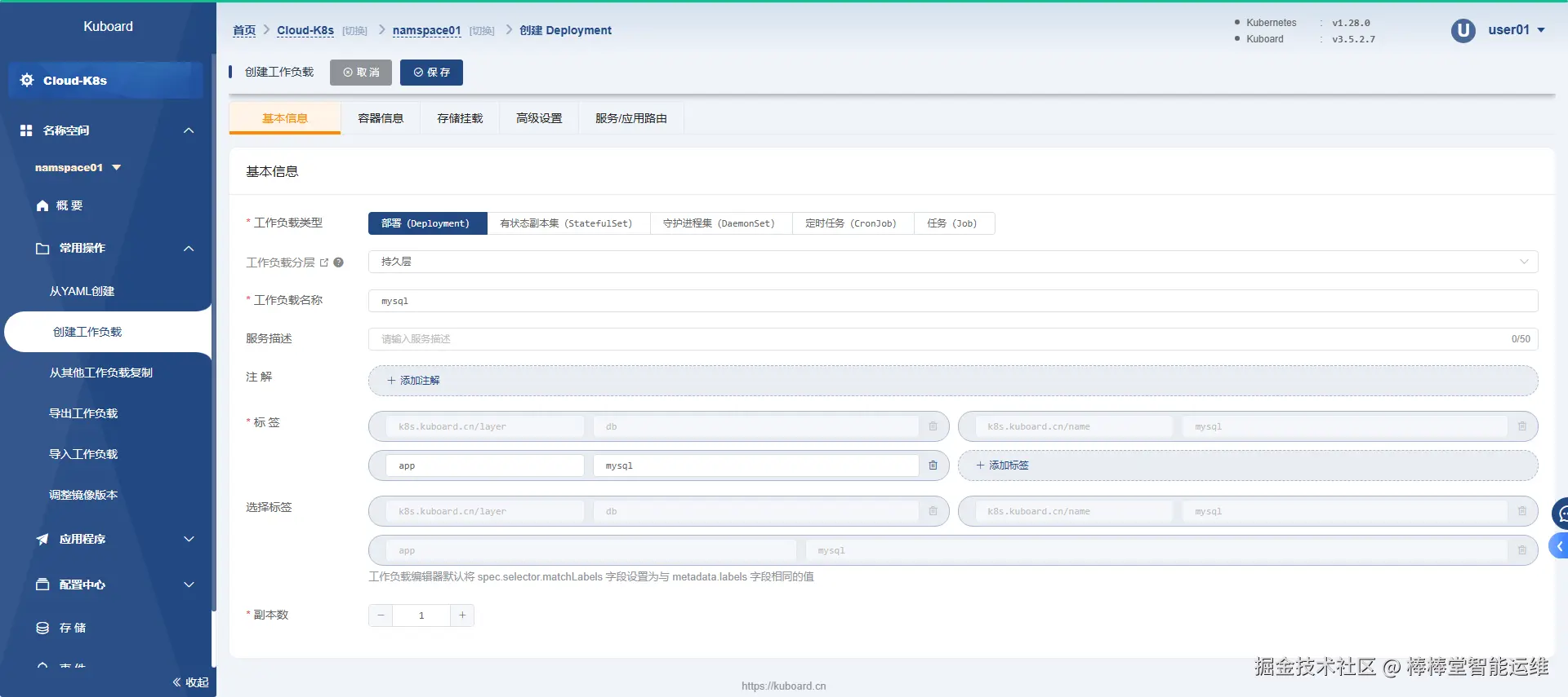 (1)点击“常规操作”->“创建工作负载”,在“基本信息”选项卡中选择工作负载类型,填写工作负载名称,以及添加标签的配置如图8-18所示。