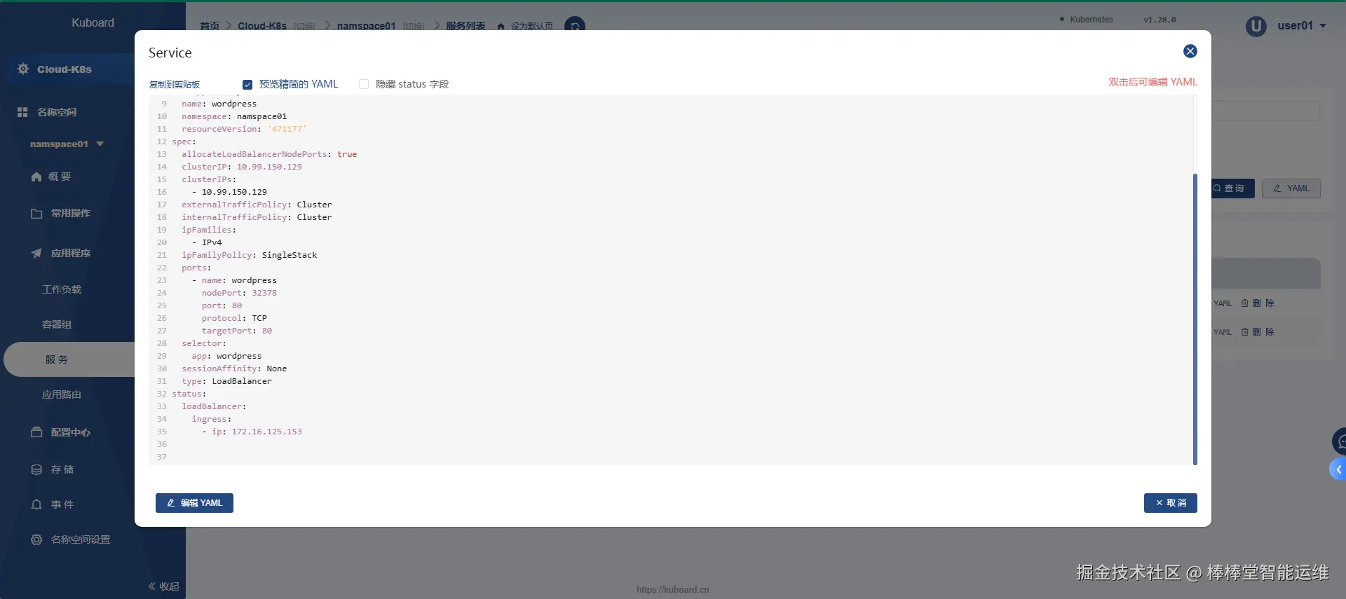 (5)发布完成后,点击wordpress服务后面的YAML查看分配的IP地址,这里分配的IP 地址是172.16.125.153,如图8-28所示。