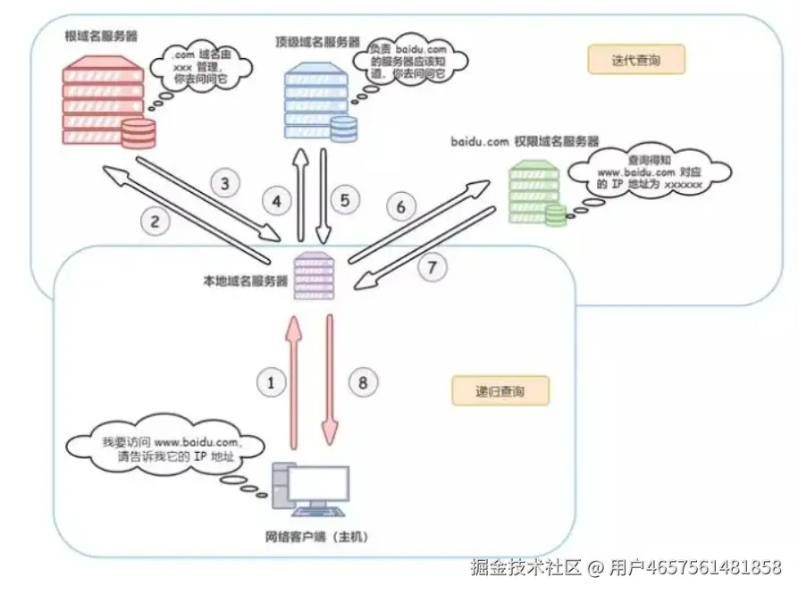 - 发送请求到本地DNS服务器,本地域名服务器缓存中如果有,直接返回,没有就向上级服务器迭代查询。
