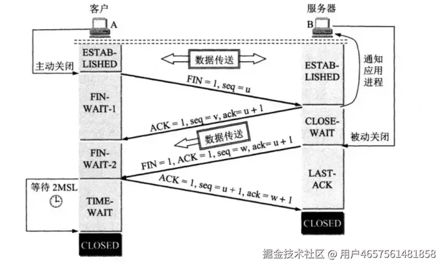 为什么是四次 客户端发送FIN报文后,表示客户端当前没有数据需要处理,而不代表服务端没有数据需要处理。此时需要服务端回复ACK确认收到报文后,开始处理内部数据。当内部数据处理完后,再回复FIN可以关闭连接
