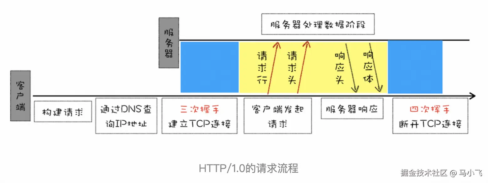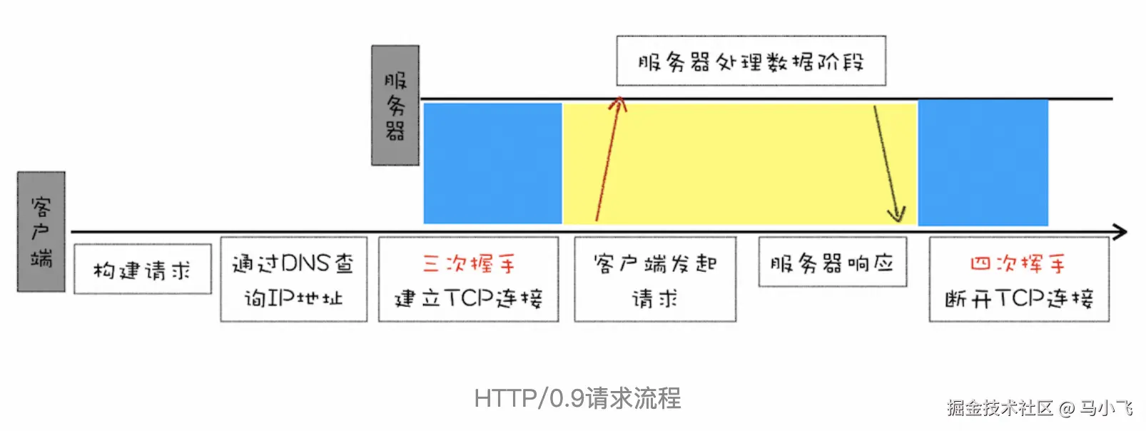 一个完成的 HTTP/0.9请求流程如下