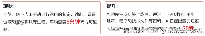 通过AI大模型帮助用户进行培训试题的生成,在一定程度上将用户从低效、低技术含量、大工作量中解放出来,是面向用户痛点的一次尝试。同时通过该场景将大模型的能力和业务场景及工程系统结合了起来,让用户得到感知,也便于后续更多的大模型实践场景的发掘和落地。