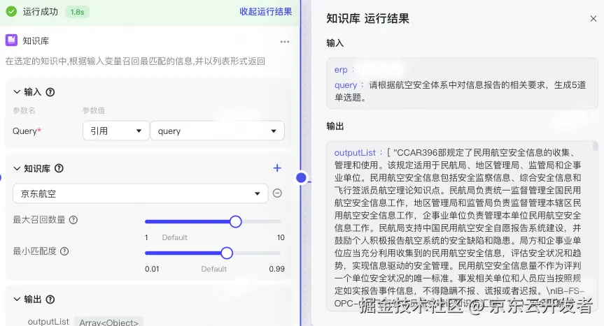 知识召回节点的目的在于从向量库中,召回本次生成范围所需的相关知识,比如某本手册等。该节点会生成一个outputList列表,其中即为相关的知识。