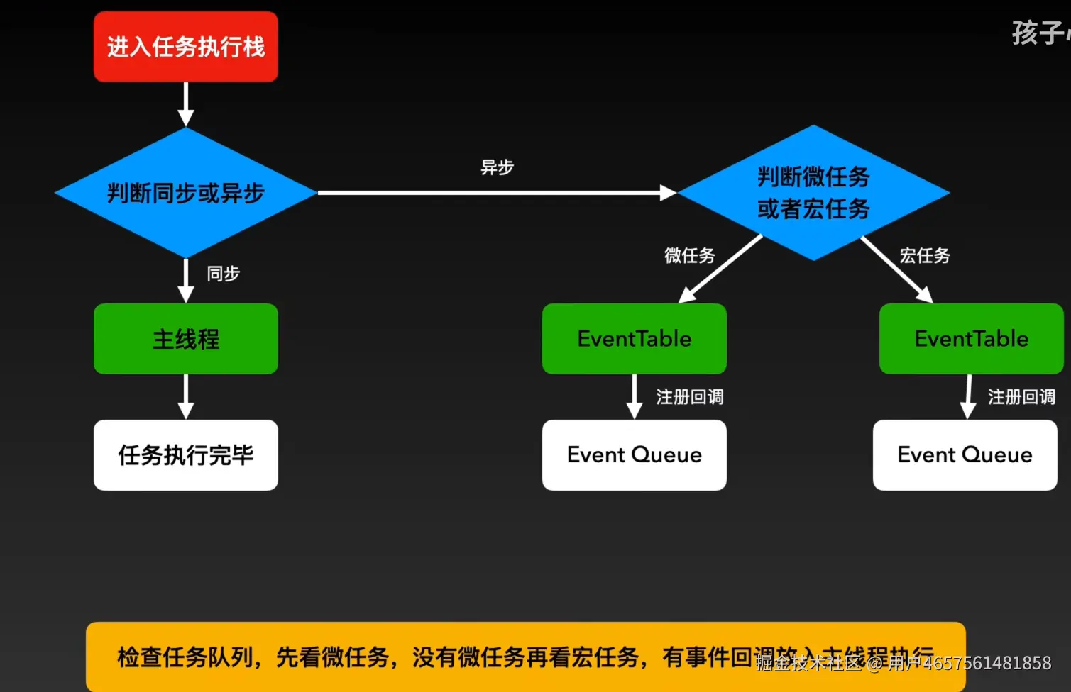 因为js是单线程执行的,而单线程在任务比较多的情况下就会产生拥堵,因此就引入了多线程机制,这里的多线程实际上是同步任务和异步任务这两种,而在异步任务里面又分为了宏任务和微任务,宏任务一般是由宿主也就是浏览器发起的包括settimeout、setinterval等,而微任务一般是由由js代码发起的一般是promise和process.nextTick,通常执行的顺序是执行同步代码,遇到异步宏任务代码会放到异步宏任务代码的队列里面,遇到异步微任务代码会放到异步微任务代码队列里面,当所有主线程的代码执行完成之后会从异步微任务代码里面读取出来放到主线程里面进行执行,当所有异步微任务代码执行完成之后就会从异步宏任务代码那边读取出来放到主线程里面执行之后就如此循环。