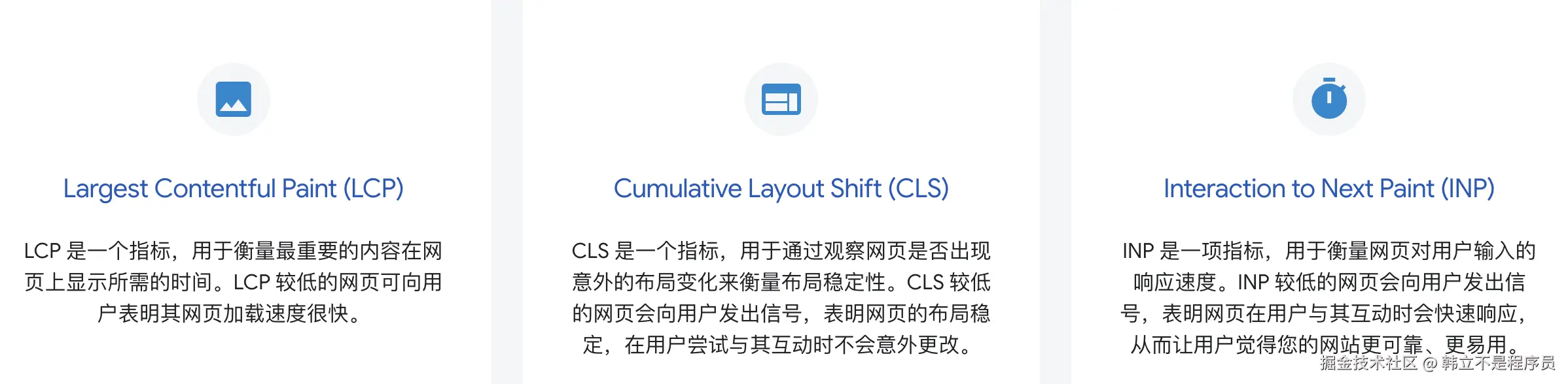 - LCP:从用户请求网址到在视口中渲染最大可见内容元素所需的时间。最大的元素通常是图片或视频,也可能是大型块级文本元素。此指标很重要,因为它反映了访问者看到的网址实际加载速度。