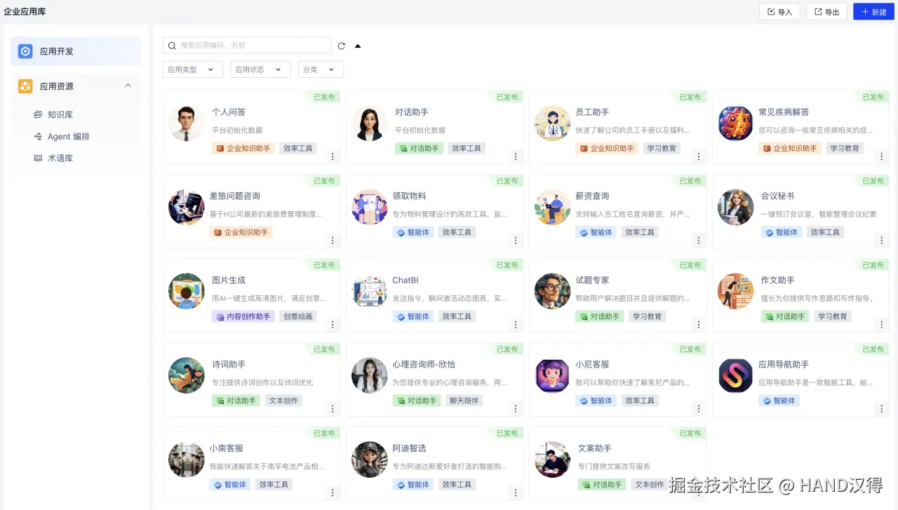 汉得灵猿AI中台致力于帮助企业快速落地AI,提供多模型对接能力,内置对话应用、可自配置的多分类智能企业知识应用、提供智能体与Agent应用编排能力。帮助企业低门槛地应用AI,提供向量管理与应用能力、私有模型训练与应用能力。