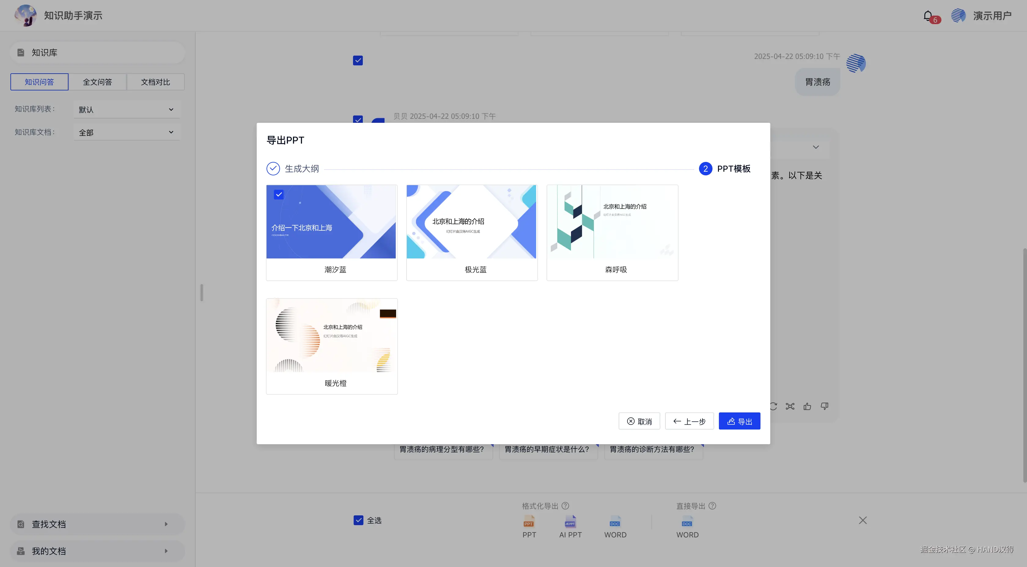 对话、企业知识助手新增更多导出模式:如支持格式化导出PPT、WORD文档,并支持对接AI PPT,让生成PPT的体验更加友好和智能。