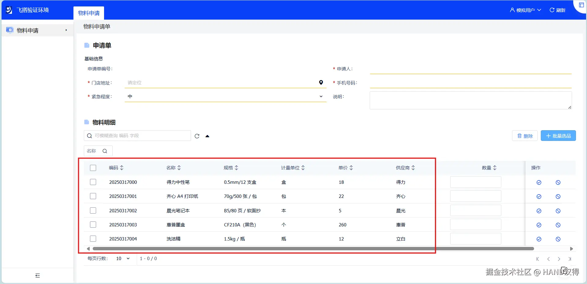 在物料采购申请业务场景下,申请人提交的申请单中需包含物料详细信息,可通过物料列表弹窗选择所需物料回填至物料明细行中。飞搭的事件流提供的获取弹窗数据等节点可快速实现此场景。