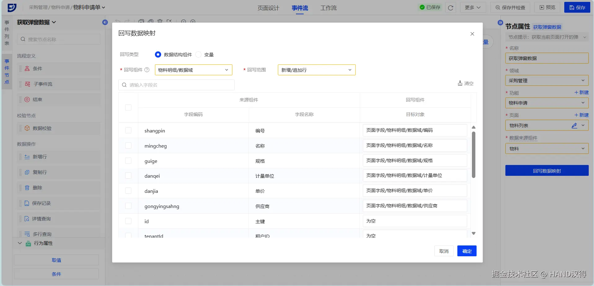 再配置【物料申请单】页面中打开弹窗及获取弹窗数据事件流。