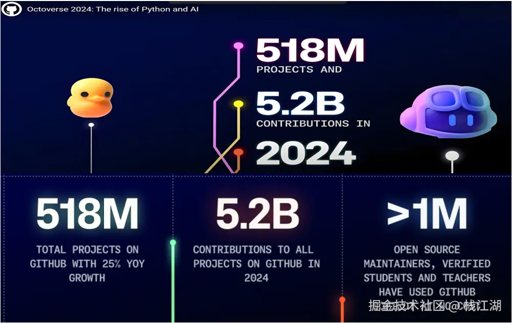 这里对GitHub Octoverse 简单说明下,GitHub Octoverse是GitHub发布的年度报告,主要是分析全球开发者社区的趋势,特别是开源项目的发展情况。