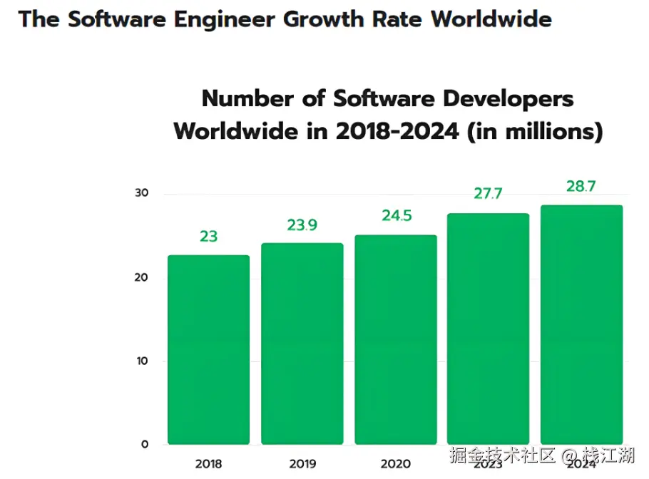 来自Evans Data的一份数据,到2024 年全球程序员将达到2870万名,仍无法满足企业需求。