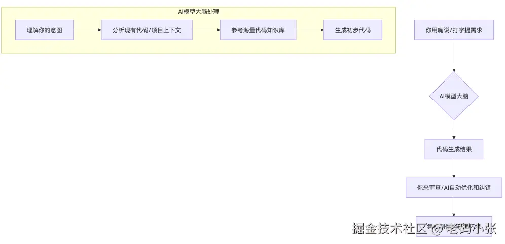 - AI模型处理:AI会结合你的需求、当前项目的代码(上下文信息)、以及它从海量代码中学到的知识,来理解你到底想干啥。