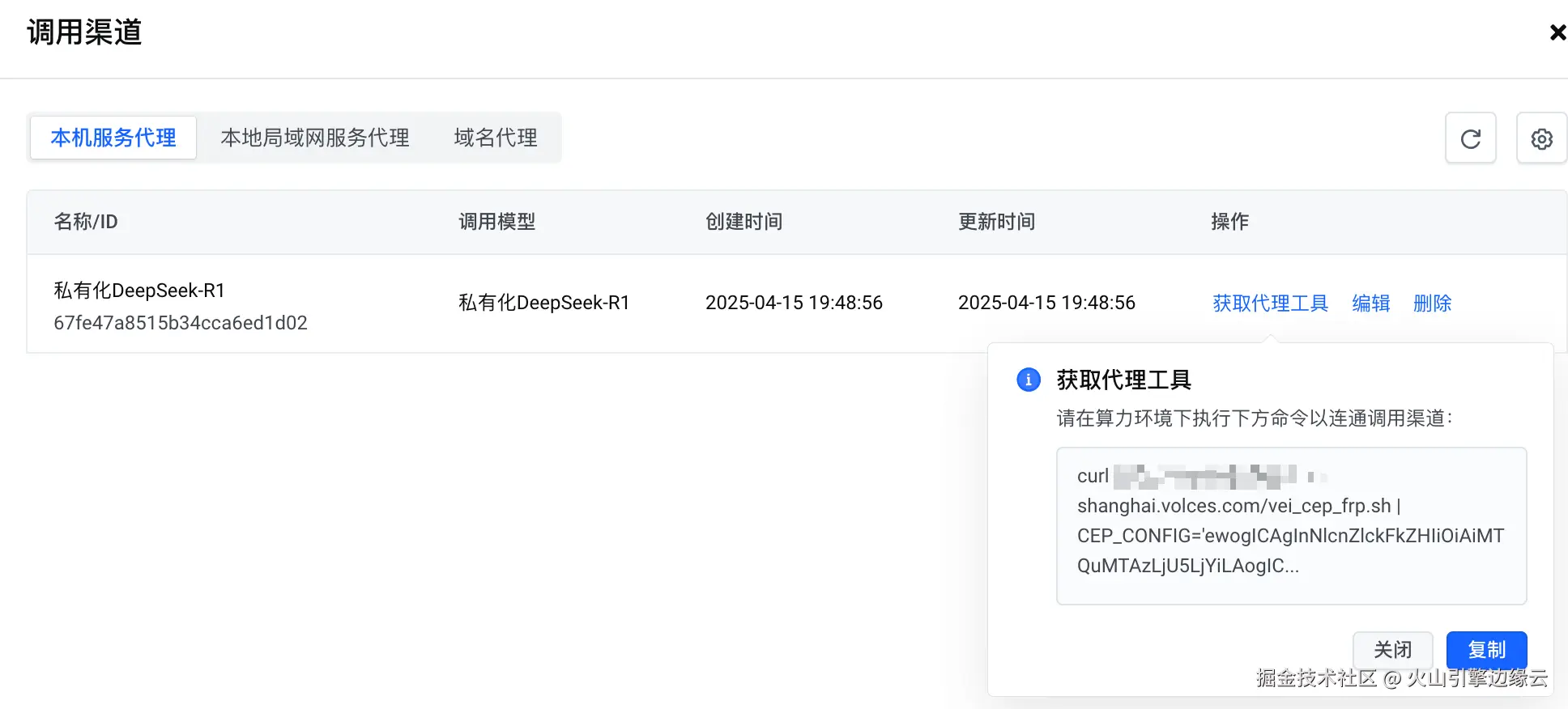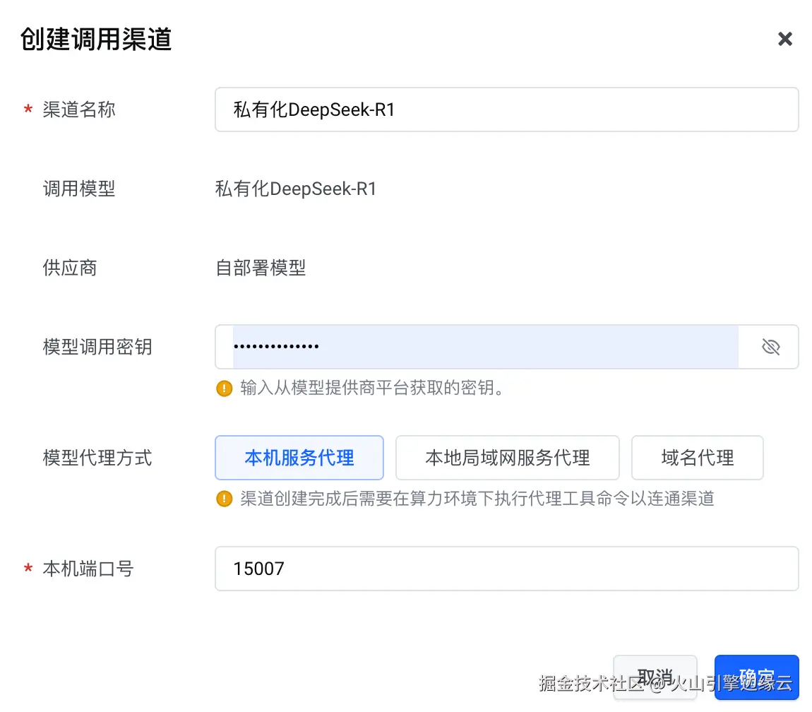 如果调用渠道中的模型代理方式是本机服务代理或本地局域网代理,您必须在调用渠道创建成功后安装代理工具,否则边缘大模型网关无法访问您的模型。