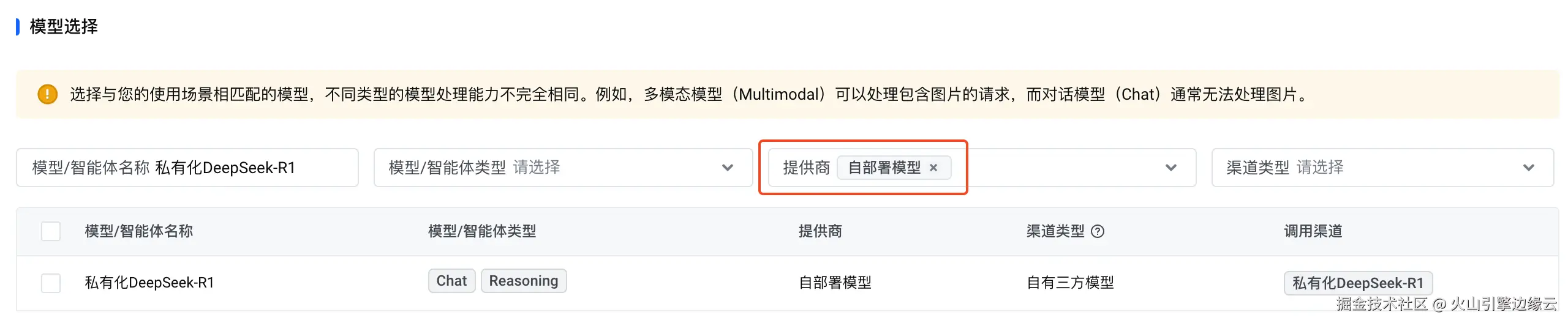 模型类型:选择模型的类型。模型类型决定了模型的用量计量方式。您可以在类型选项上查看对应的计量方式(如 Chat 类型对应于 Token用量)。支持多选,但只允许选择用量计量方式相同的多个类型。