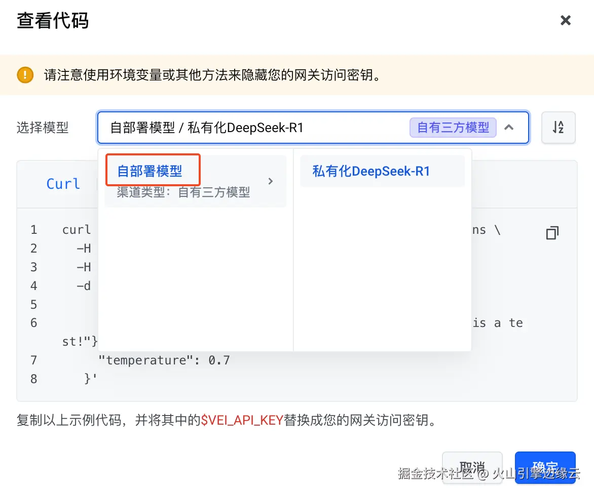 当您的网关访问密钥绑定了自部署模型调用渠道,您在获取此网关访问密钥对应的示例代码时,就可以选择指定模型作为被调用对象。将示例代码集成到您的业务逻辑后,您的边缘大模型网关请求将触发指定模型调用。