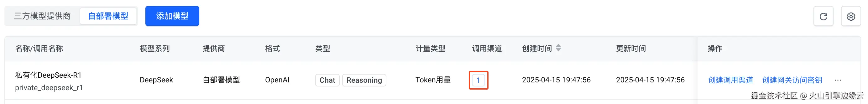 在自部署模型列表,调用渠道数字表示一个自部署模型下已创建的调用渠道的数量。以上操作完成后,相应自部署模型的调用渠道数量会增加。您可以单击调用渠道数字,查看和管理(如编辑、删除)自部署模型下已添加的调用渠道。