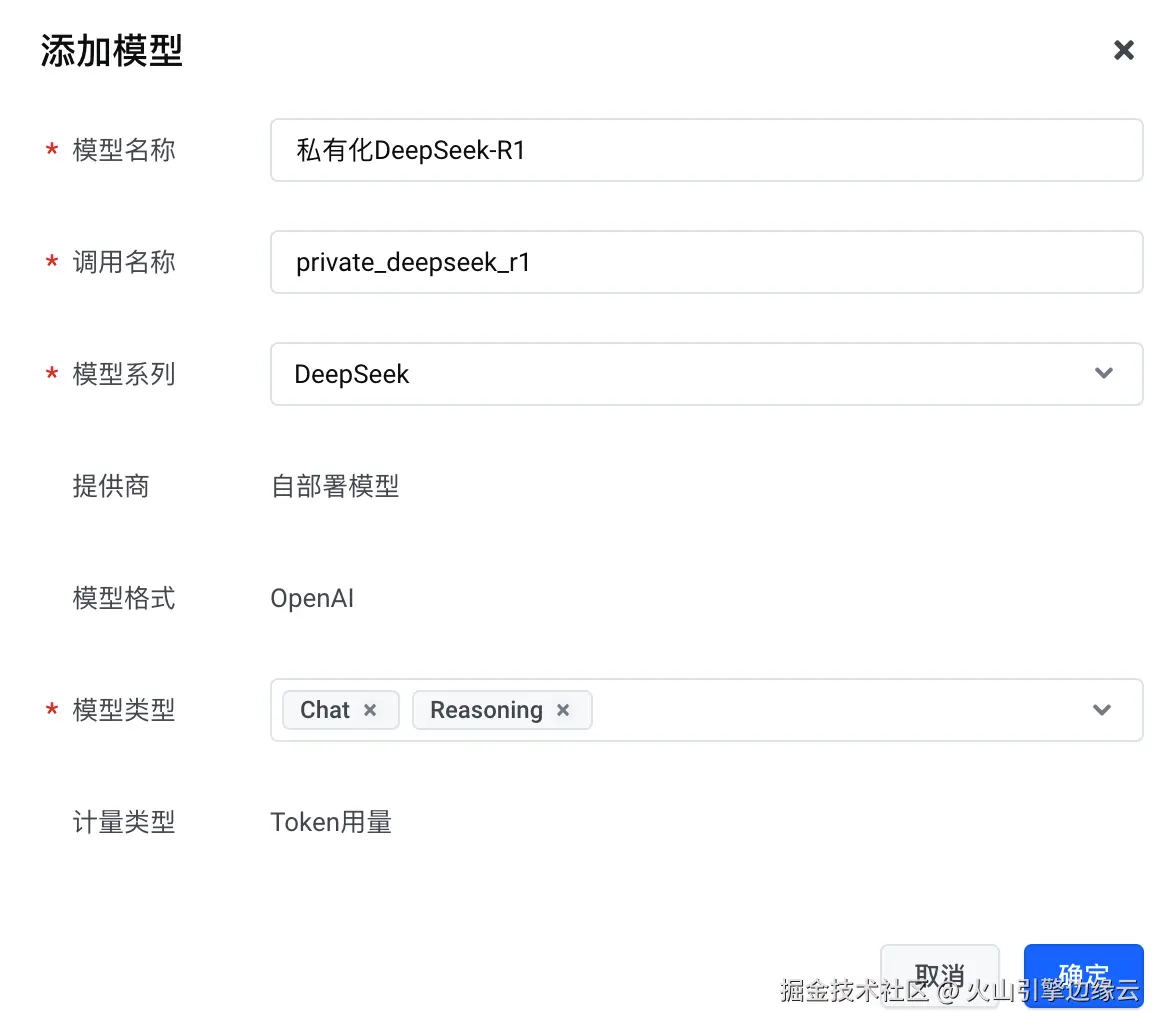 将本地部署的 Deepseek-R1 命名为“私有化 Deepseek-R1 ”,这就是一个部署且运行在本地的私有化大模型了,不仅无需网络即可运行,还可以通过上传本地数据,打造属于自己的“知识库”。如果想通过边缘大模型网关调用“私有化 Deepseek-R1 ”,并且进行全链路的管控,应该怎么操作呢?第一步就是添加自部署模型,以下是详细步骤: