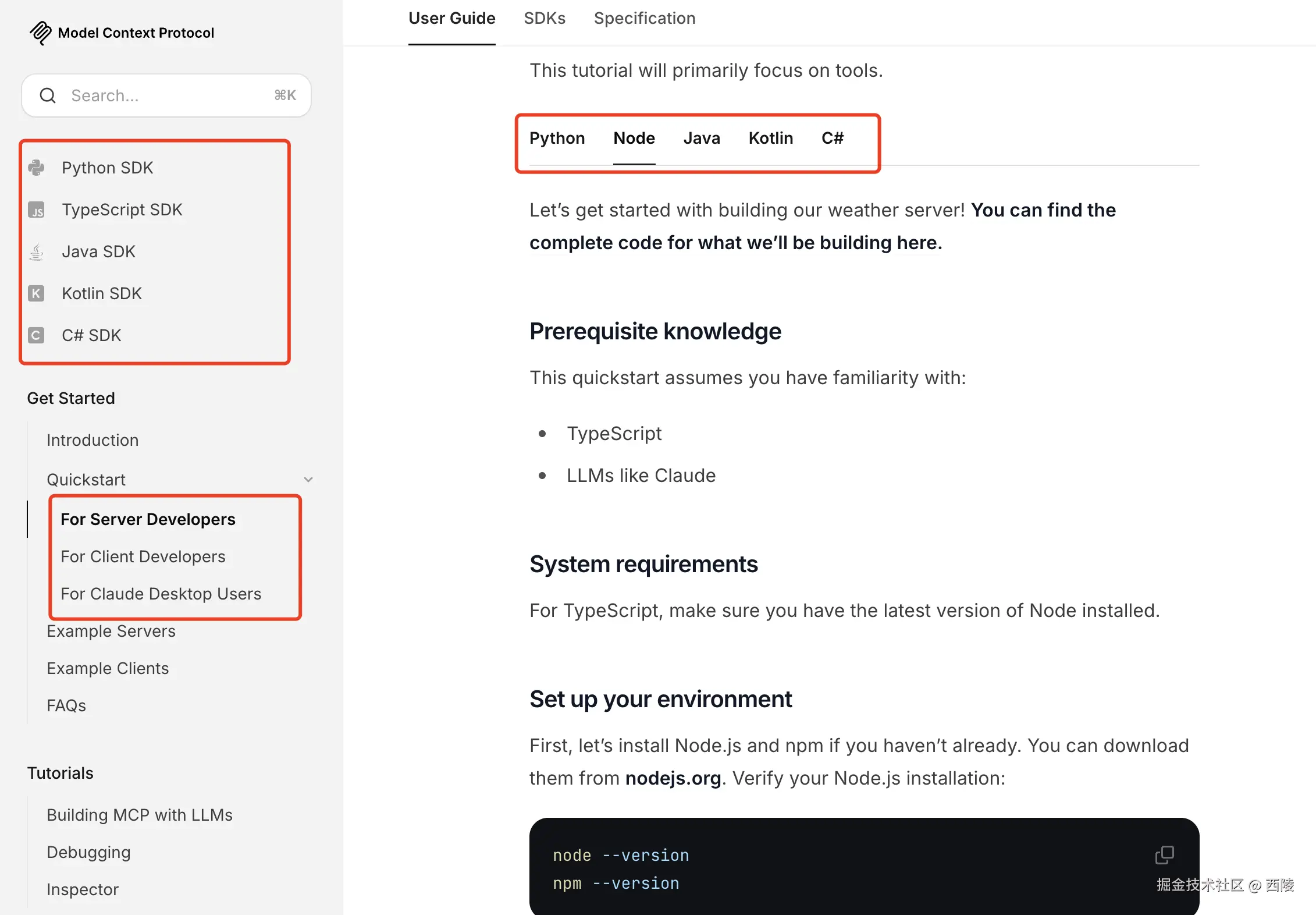在官方文档中可以找到 MCP Server 的开发方式,并且官方提供了各个语言的 SDK 的示例代码: